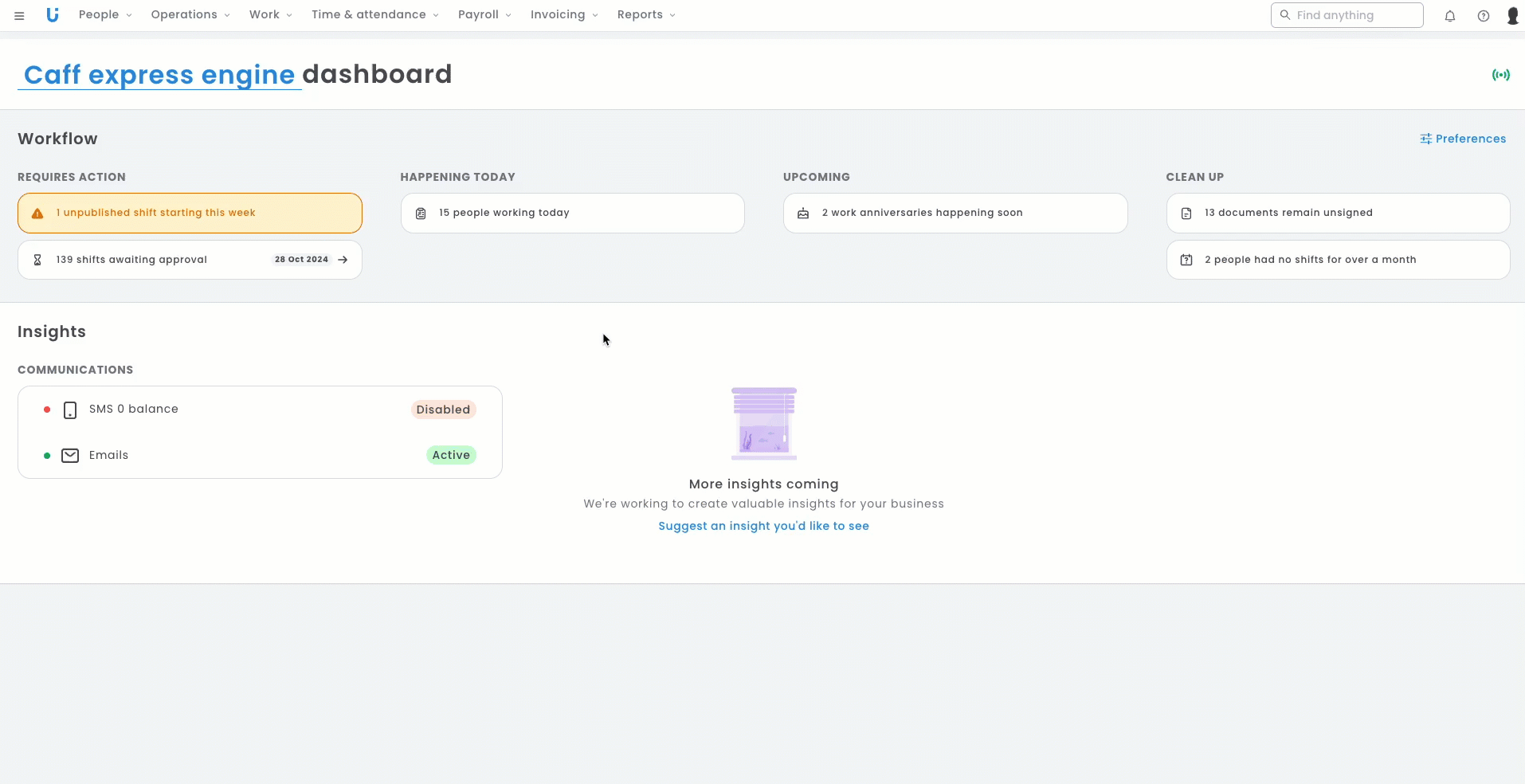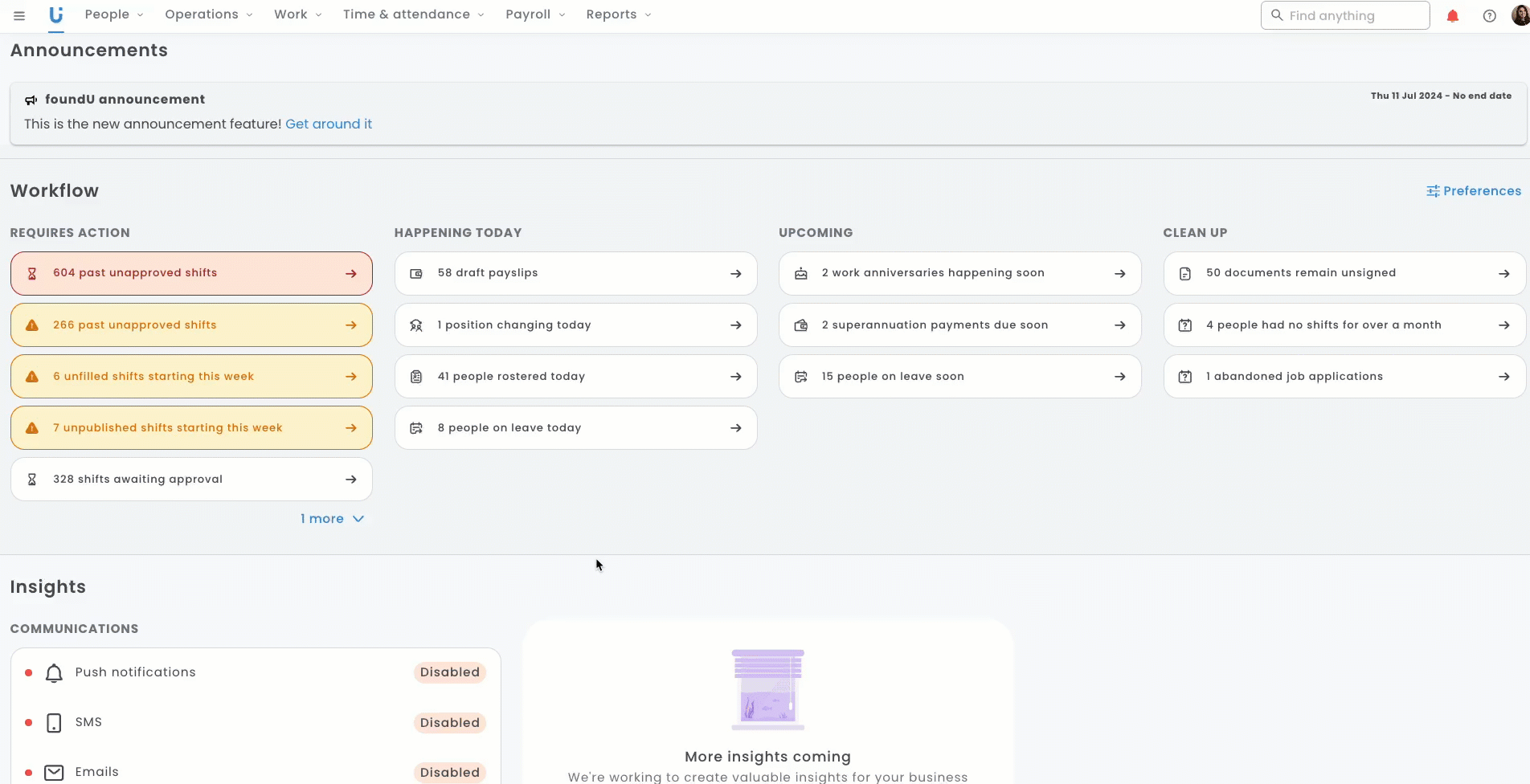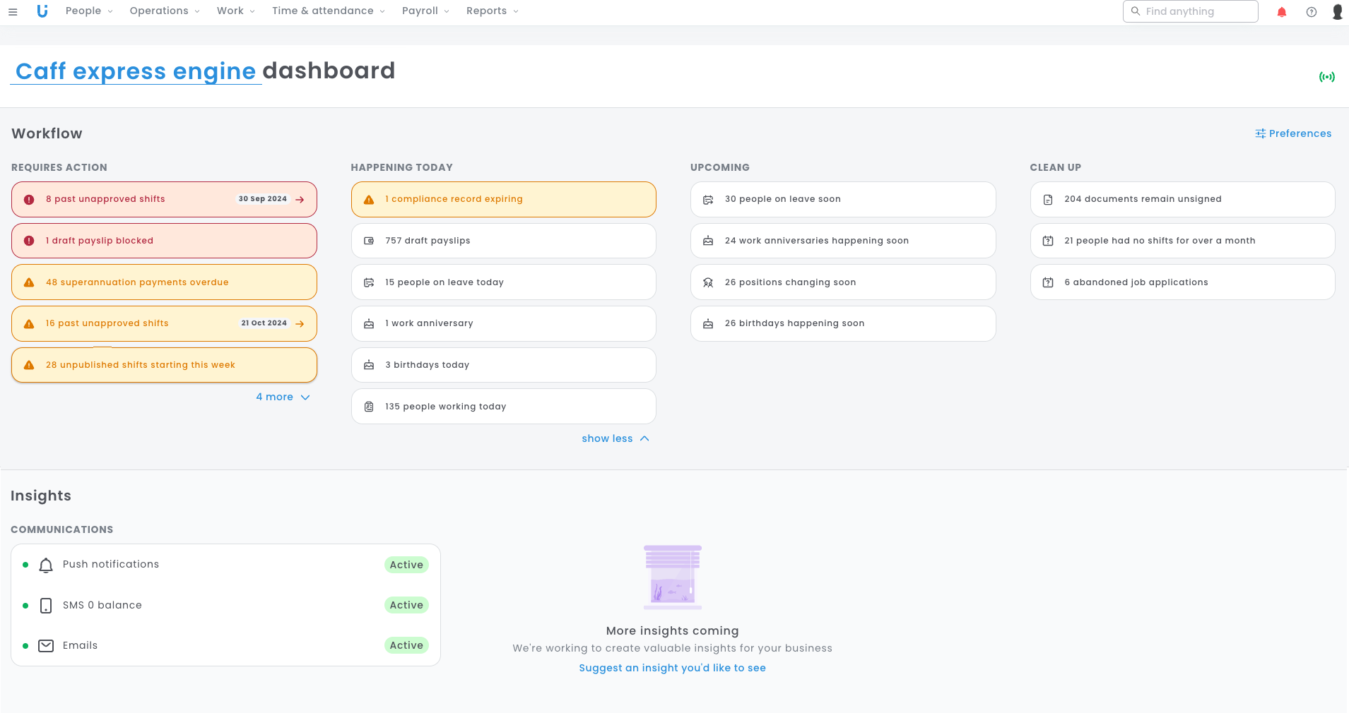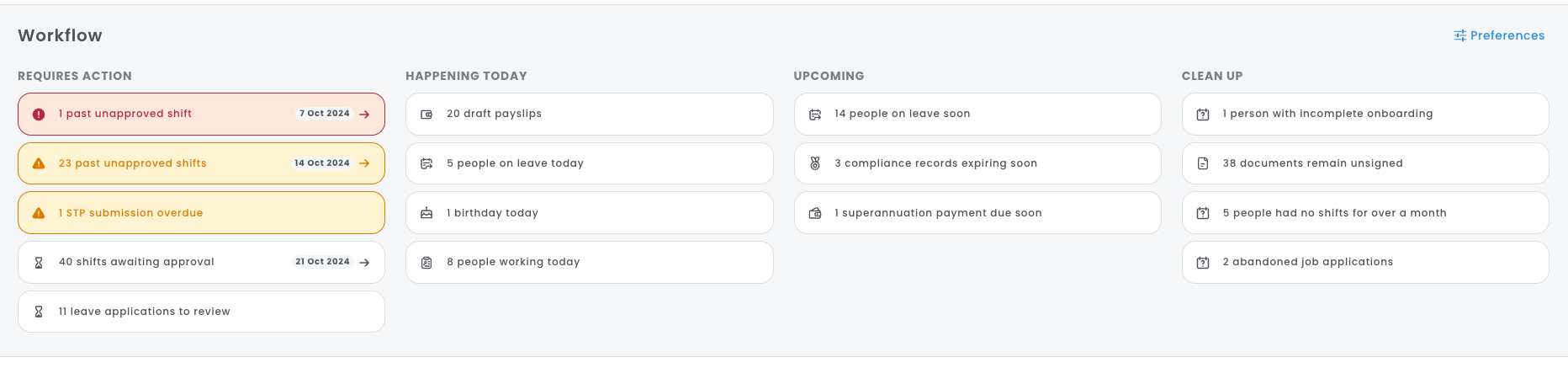 These workflows and insights will allow you to navigate to parts of your platform that require different tasks at varying levels of urgency, as explained below. Where cards are affected by a pay period, you'll note the presence of a date on the workflow card. If your business has fortnightly pays, you may see duplicated cards (one for each week) for the same action.