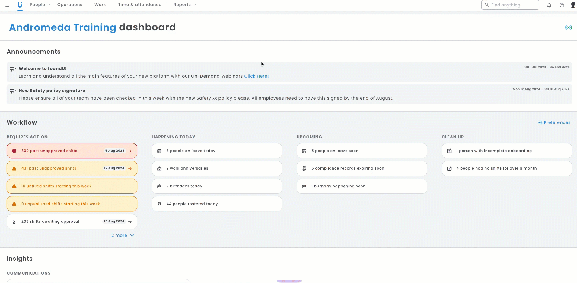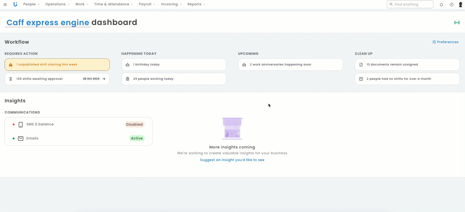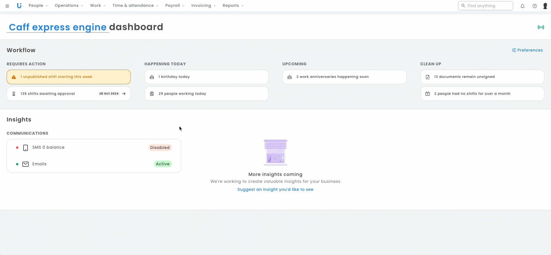 - Provide a concise overview of current business activities, including pending leave requests, shifts awaiting approval, processing of payslips, and important announcements