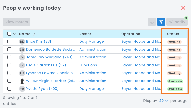 You may need a quick list of people working today for all employees in your business or on a certain roster or operation. This may be handy to do a roll-call after a safety or emergency evacuation.