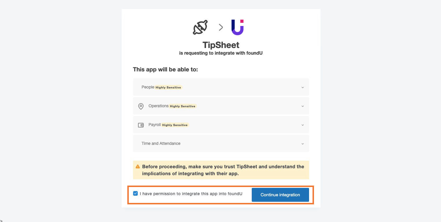 Log in to your foundU Admin Portal; you will be prompted with a permissions request. Select the checkbox and then Continue Integration. Once confirmed, you will be directed back to Tip Sheet.