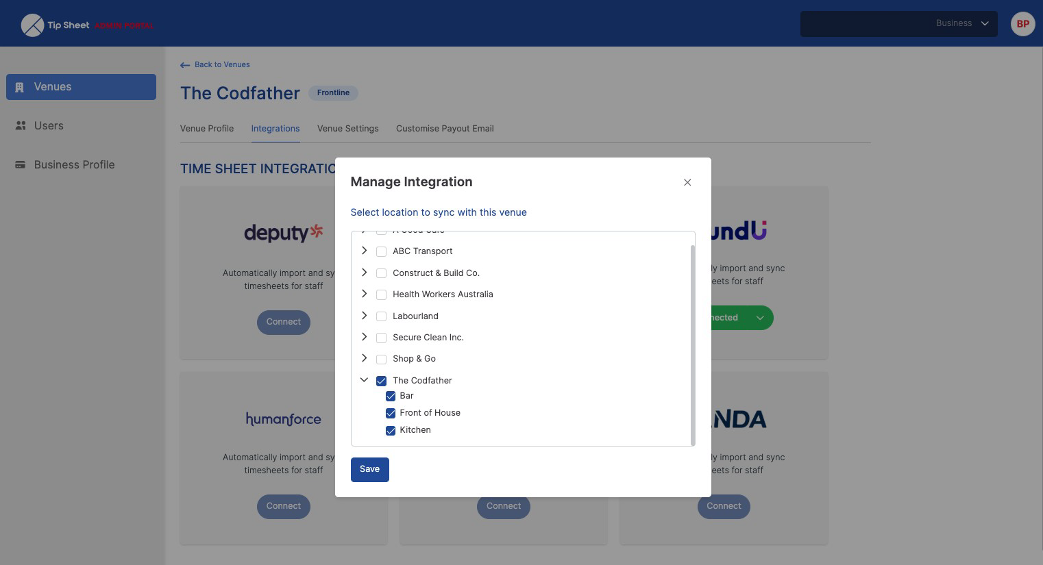- Each Venue can be integrated separately to allow for greater customisation. From the main menu, navigate to Venues > Locate your venue > Select venue.