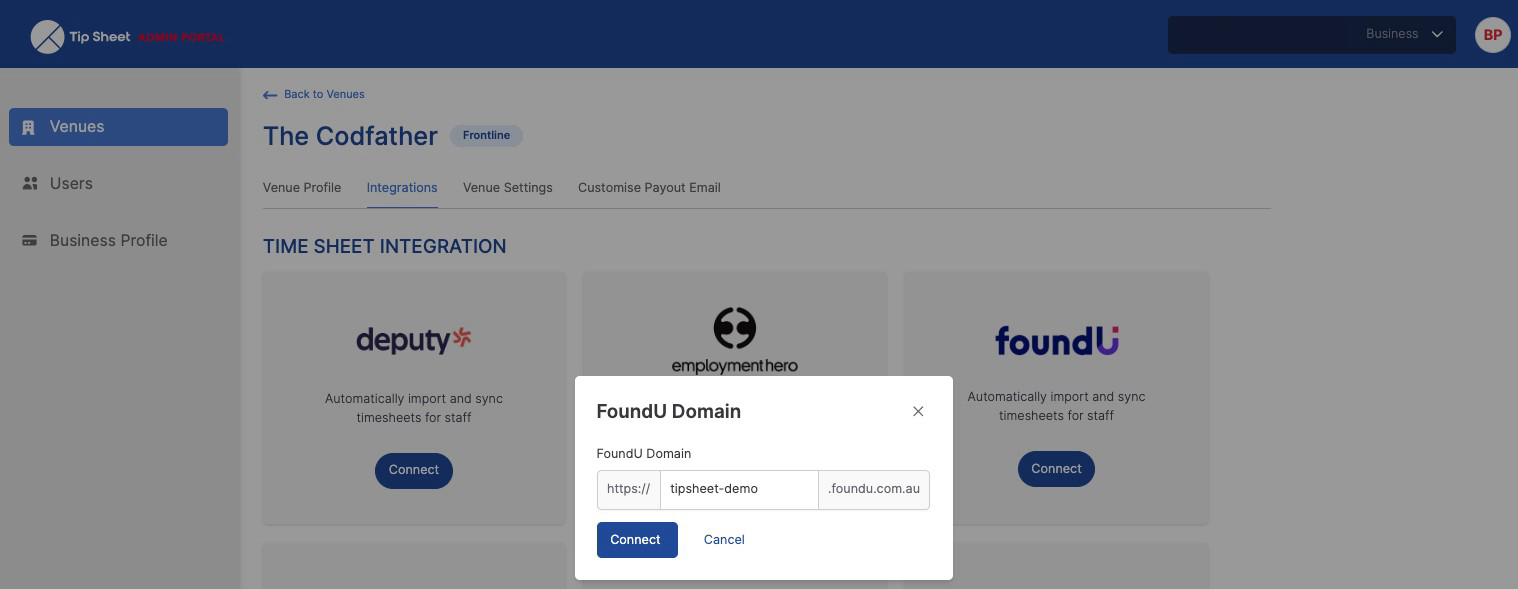 - In Tip Sheet, navigate to Integrations from the Venue's profile and locate foundU.