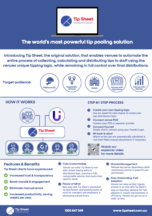 Tip Sheet is a fantastic resource for those in the Hospitality Industry. It simplifies how tips are calculated, distributed, and paid to your staff.