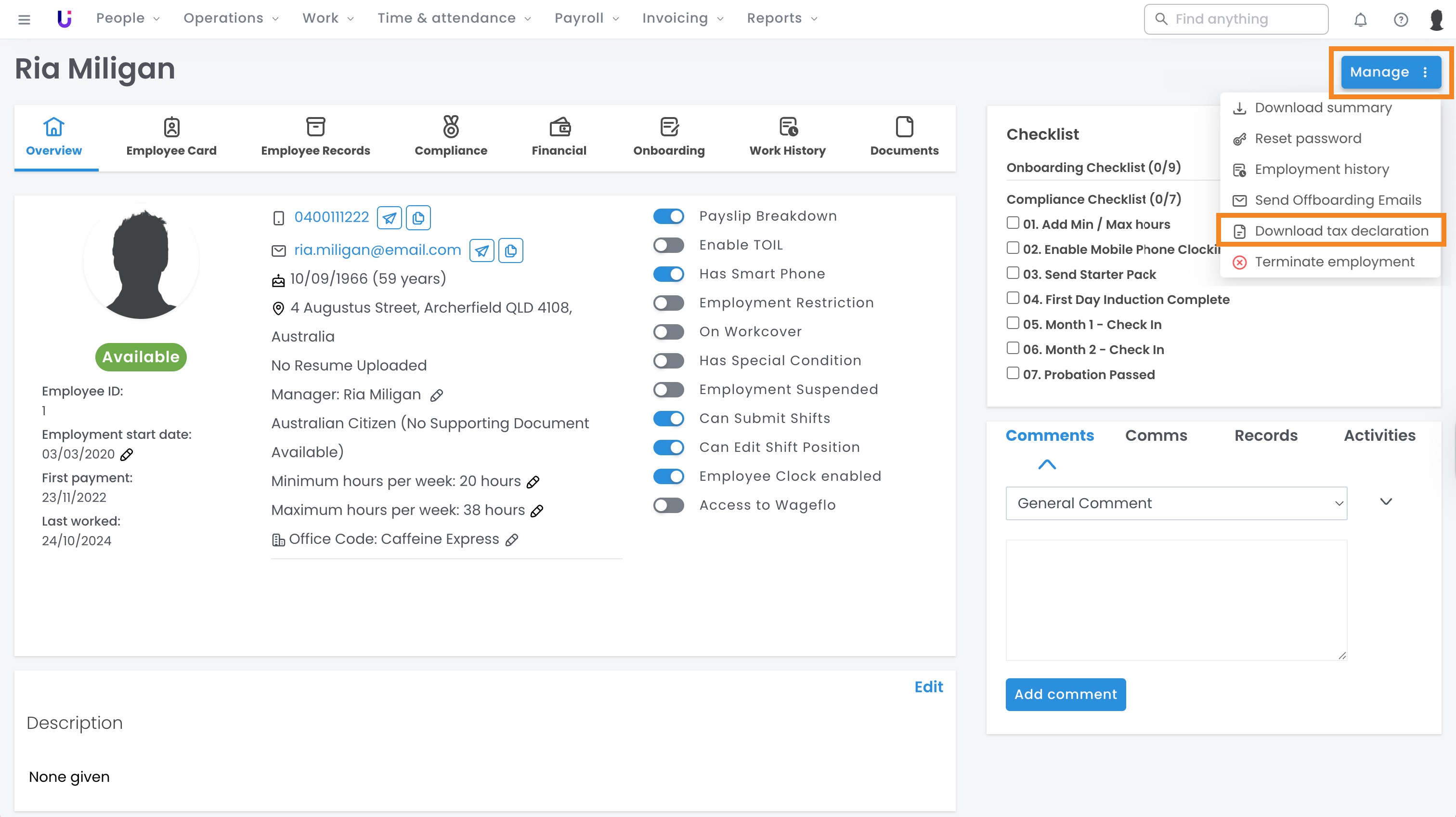 - Accessing an employee's latest TFN Declaration via the Manage menu