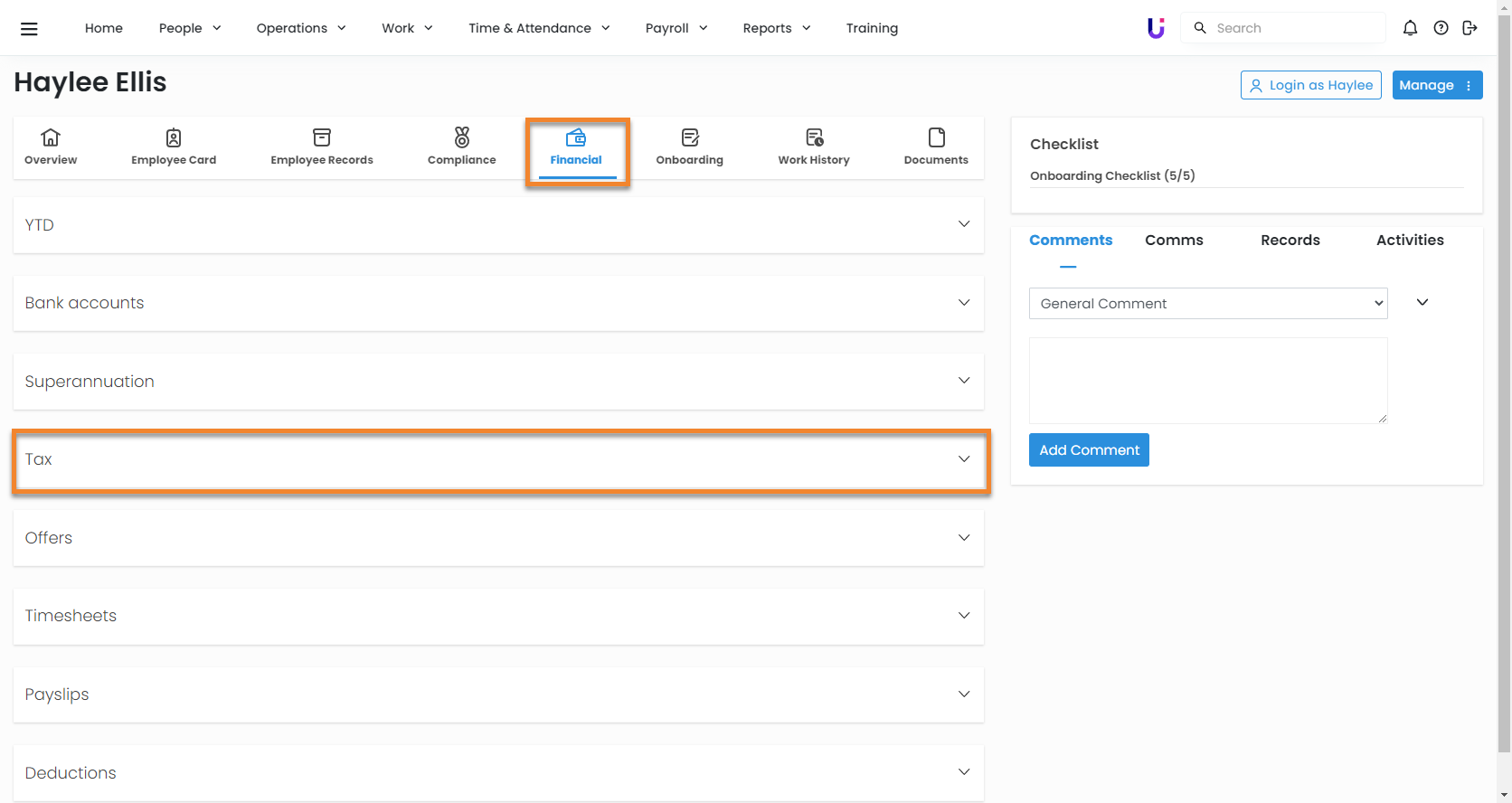 - Accessing an employee's history of TFN Declarations via the Financial area