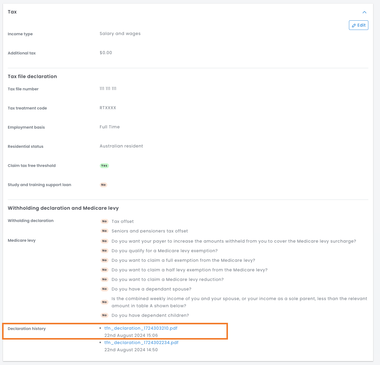 As an admin in the platform, you have the ability to view and download an employee's latest TFN Declaration or view a history of changes that an employee has made on their TFN Declaration.