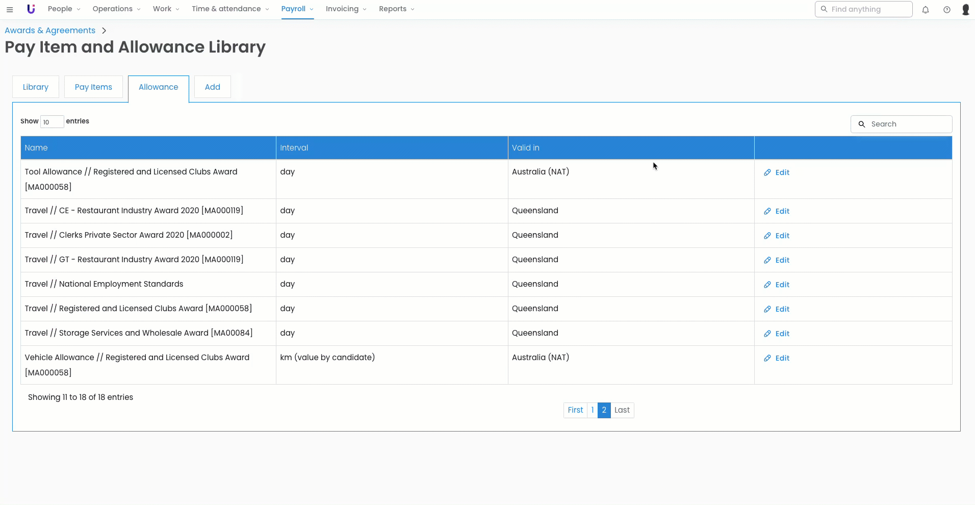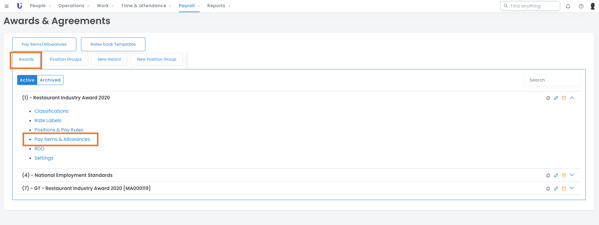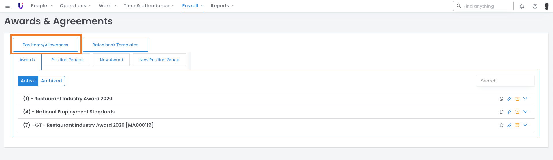 As your business needs change, you may need to edit or update your Pay Items and Allowances. You can view, edit, or delete your existing items from the Awards & Agreements menu.