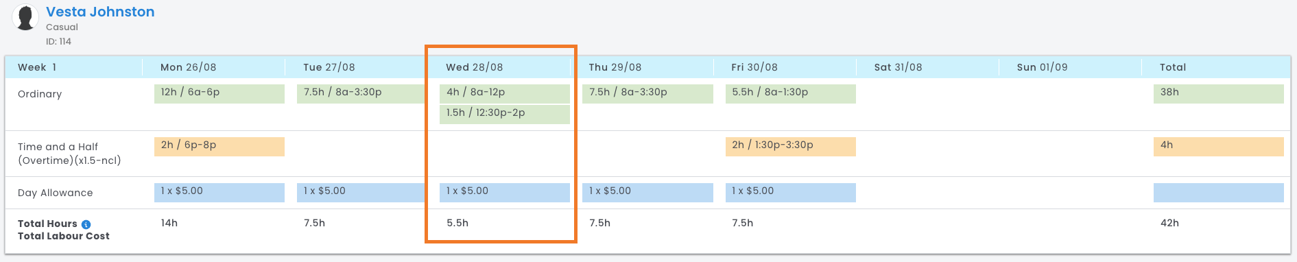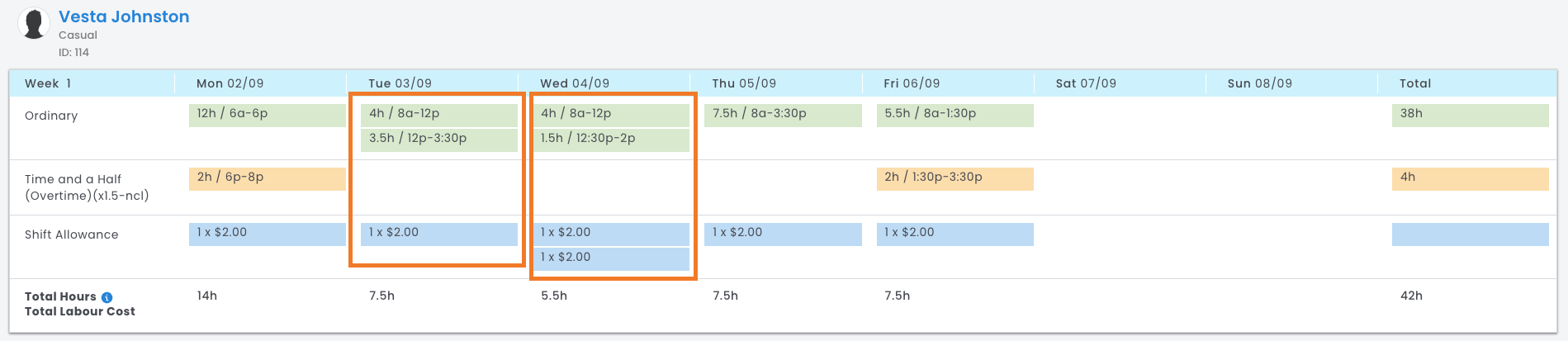 In the example below, we can see on Tuesday, there are 2 back to back shifts where the end time for the first shift and the start time for the second shift are both 12 pm, as there is no time gap between shifts, only 1 shift Allowance is being applied. If we look at Wednesday, there is a 30 minute time gap between the shifts; as such, each shift is treated separately, and a shift Allowance is applied to each. This will be the case for any gap between shifts even 1 minute.
