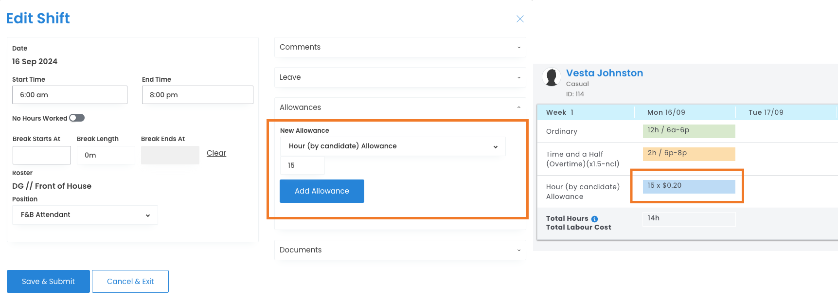 - Hour (value by candidate) - The employee using submit shifts or a manager specifies the total number of the Allowance that applies.