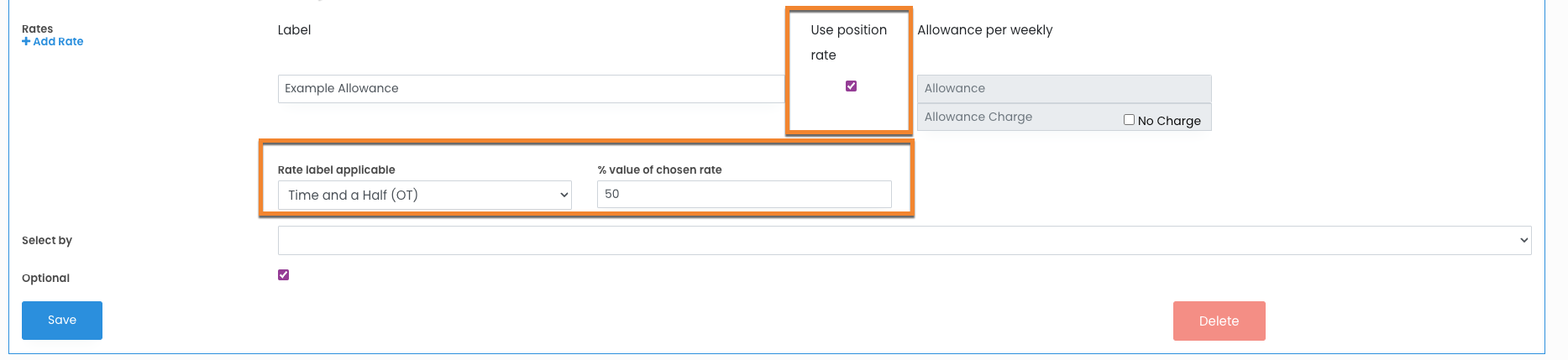 - Use position rate - Optionally apply this to a specific position rate within your chosen award. Once selected, apply the chosen rate label and percentage of that rate.