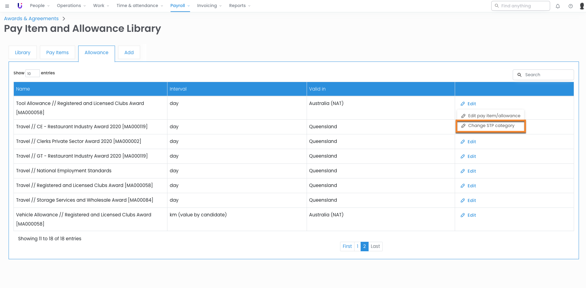 You may find that your Pay Item or Allowance has been attributed to the wrong STP category, which you'd like to correct. If this is the case, users with the relevant permission will have access to change the STP category assigned to Deductions, Pay Items, Allowances and leave items.