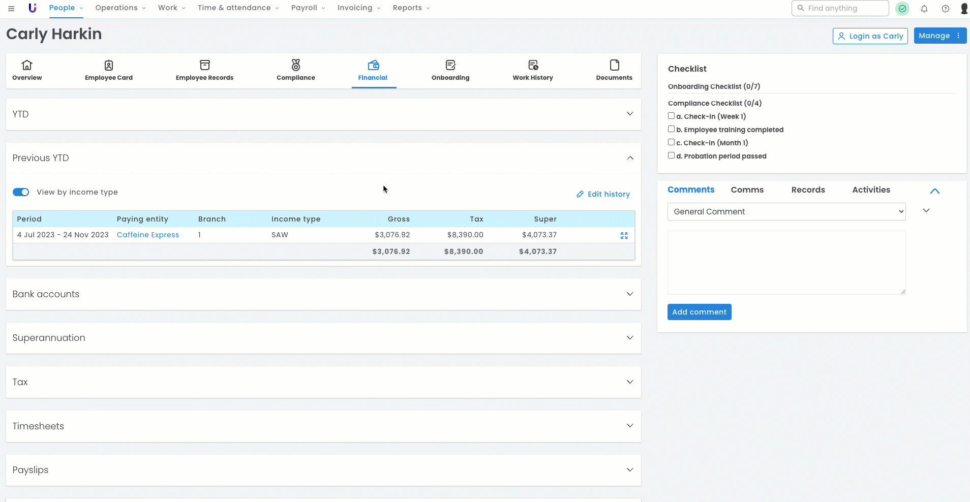 - Navigate to the relevant employee profile via People > Approved People or from the global search function.