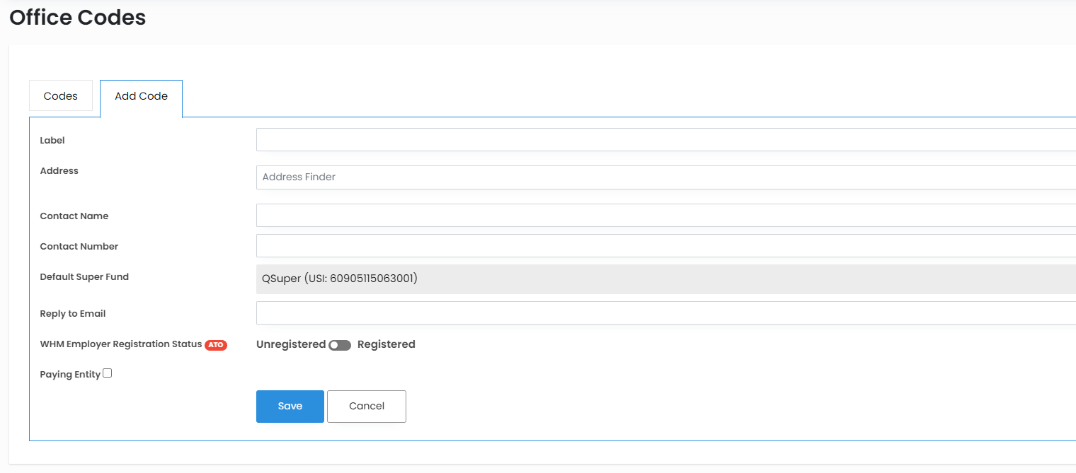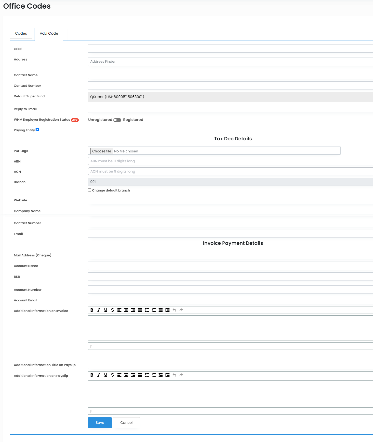 Office codes that are set up as paying entities will use the details within to pay employees. Multiple paying entity office codes can be set up with the same details. This allows you to pay employees from the one paying entity while splitting your reporting into separate office codes.