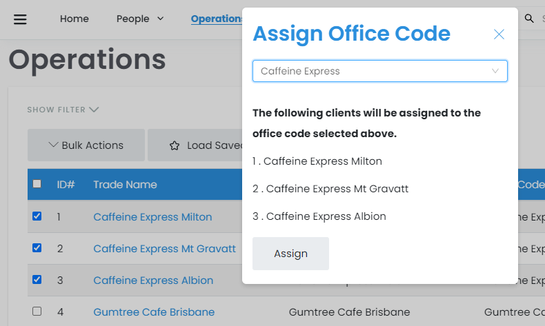 - Select the desired Operations > Bulk actions > Assign Office Code to Selected.