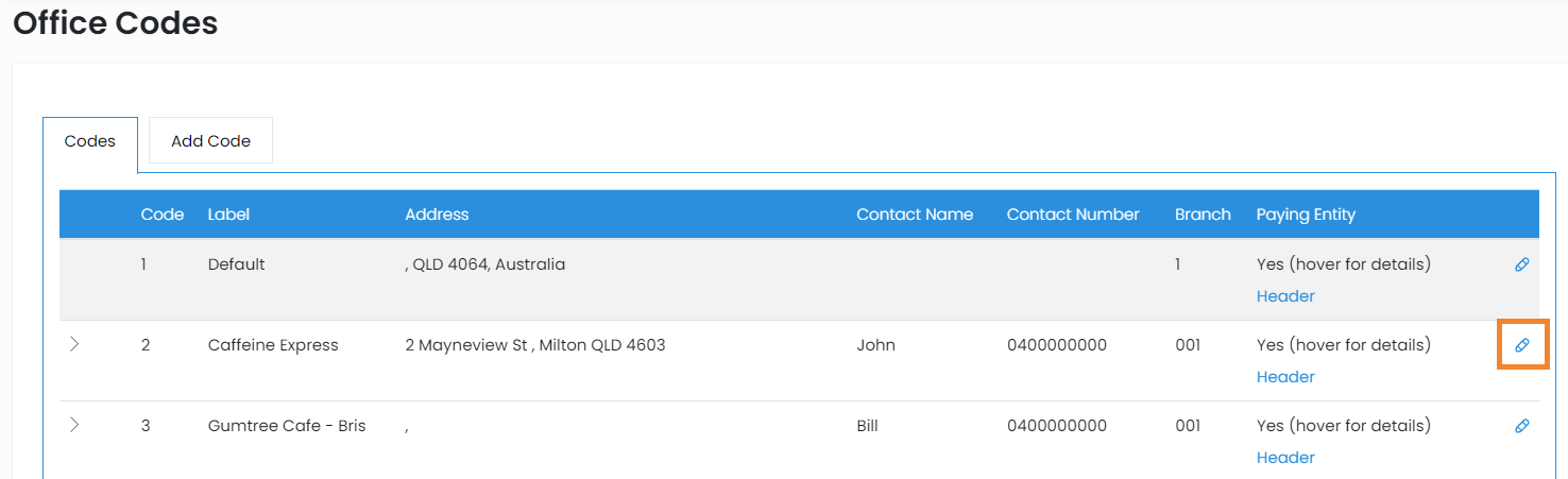 - Navigate to the main menu > Payroll Settings > Office Codes, then click the edit icon to the right of the office code.