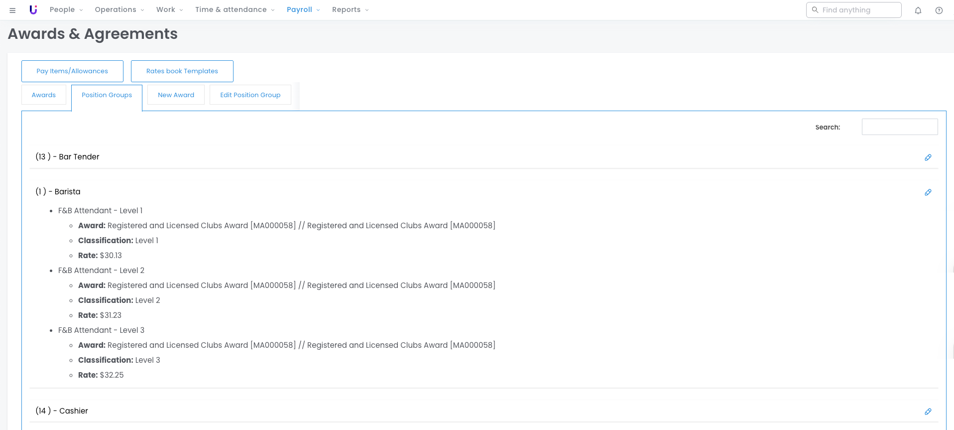 For example, in the image below, we see the list of positions for F&B Attendant Levels 1-3 from the Registered and Licensed Clubs Award. These positions have been grouped together in a Position Group, labelled Barista.