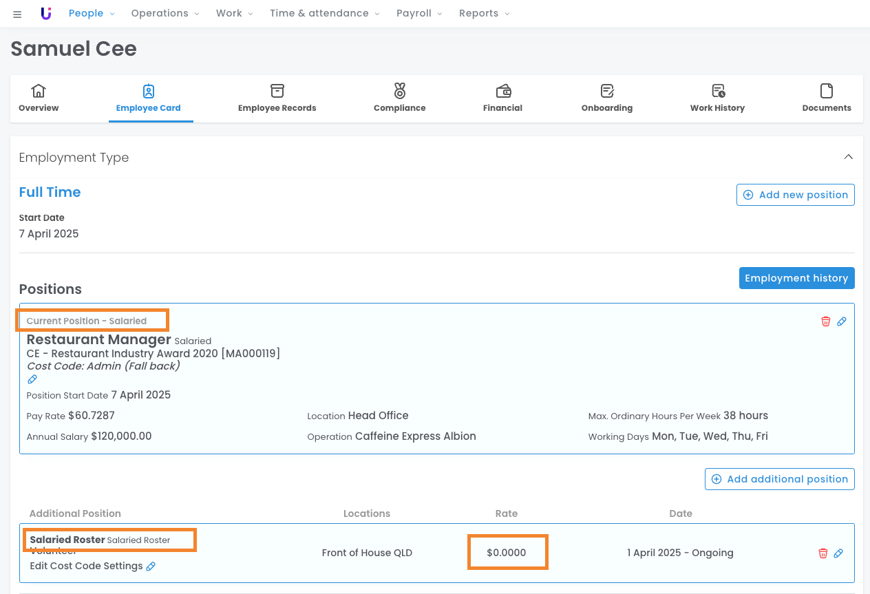In the image below, we can see that Samuel has a Primary Salaried Position of Restaurant Manager; this is the position from which his payslip will be created and for which he will be paid.
