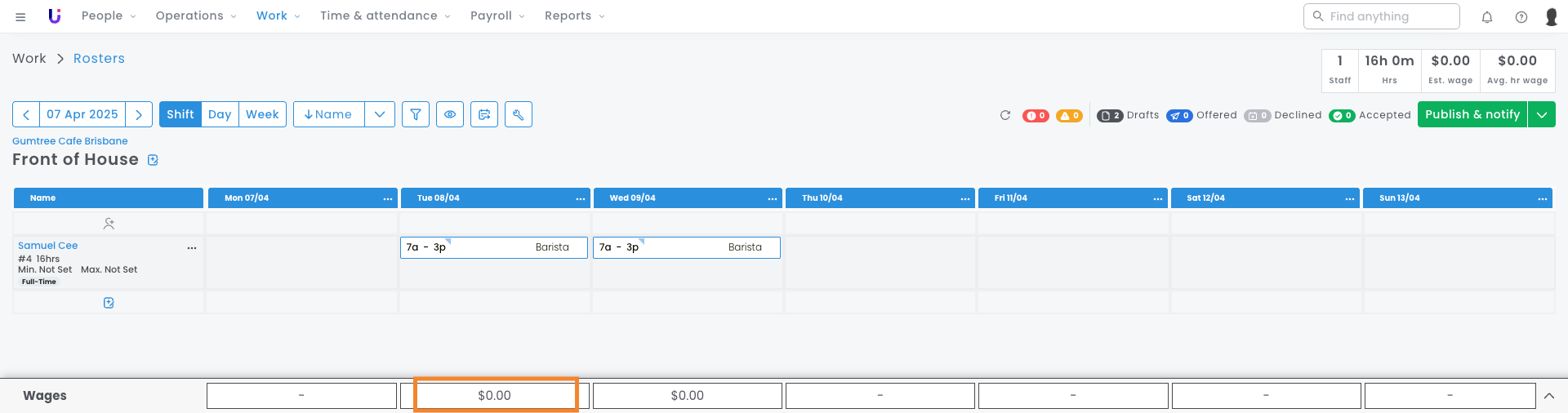 In the image below, we can see the salaried employee, Samuel, has been rostered using his additional position. This shows a total wage cost of $0.