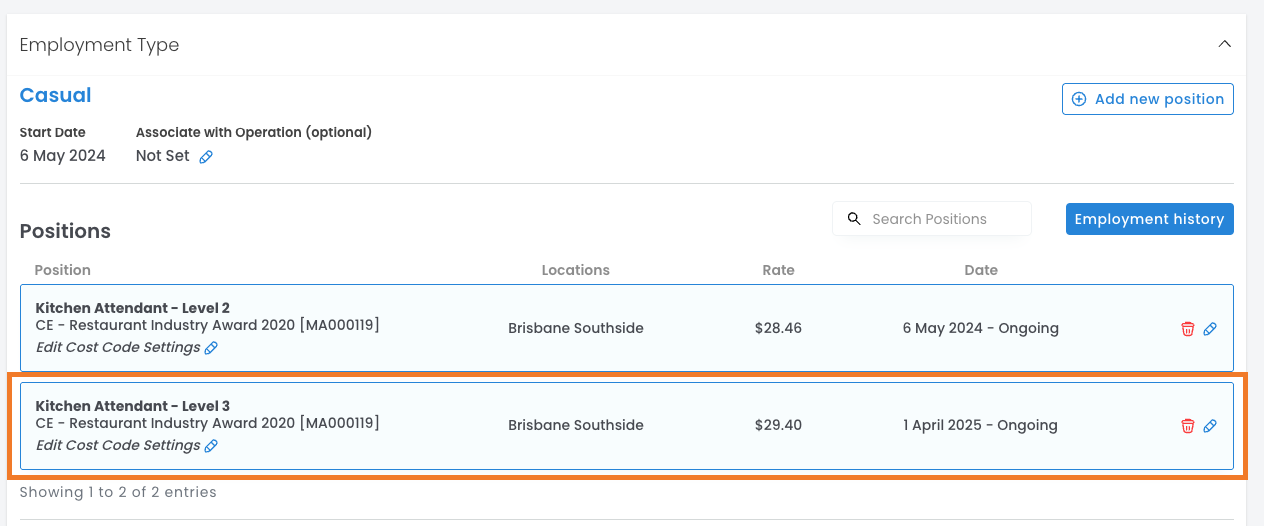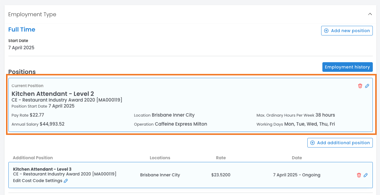 - If your employees hold multiple positions on their profiles, you'll want to think about how to organise your Position Groups. This matters because, during rostering, only one rate set on the employee's profile will be used.