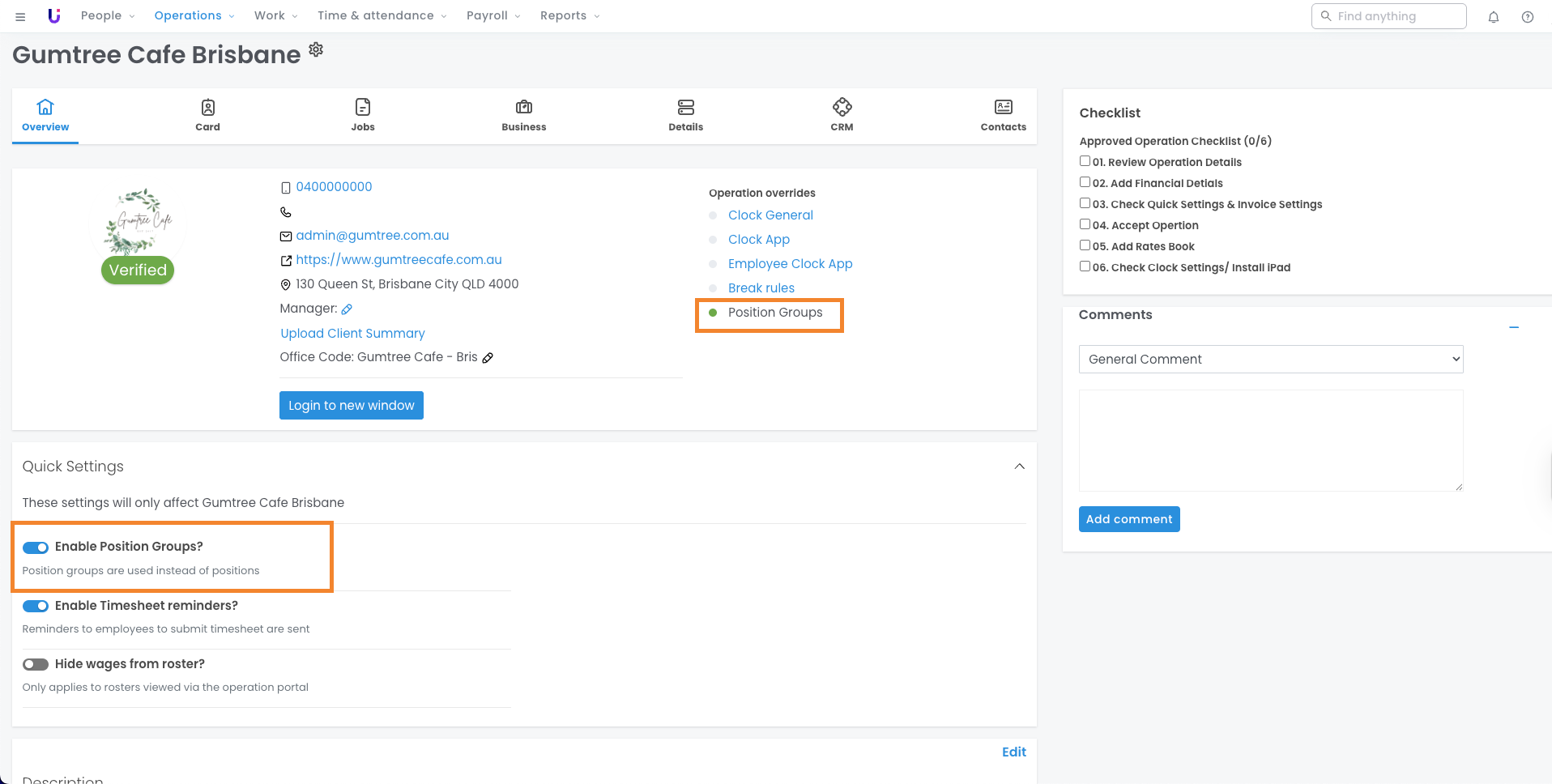 - If you use Position Groups to assign a position to employees' profiles, we advise that you do not also use them for rostering. With this in mind, when setting up your Operations, please ensure the 'Enable Position Groups?' setting toggle is off.