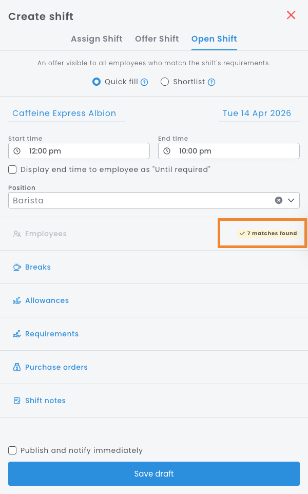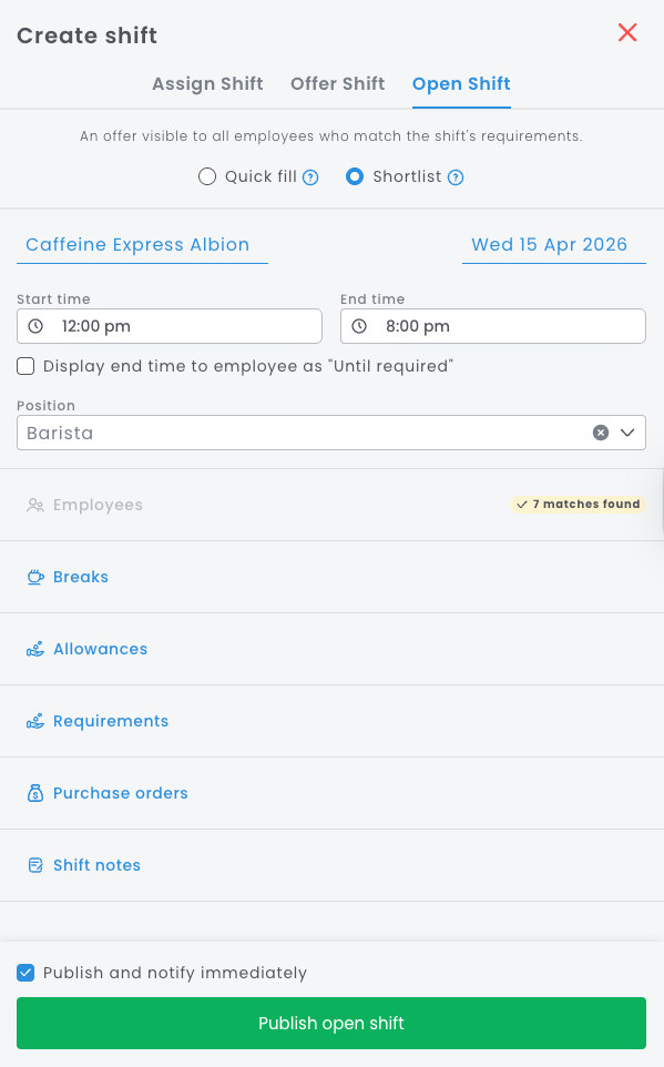 Open shifts are designed to make filling shifts quicker and easier. Instead of manually selecting employees one by one, you can send a shift out to a group of suitable team members.
