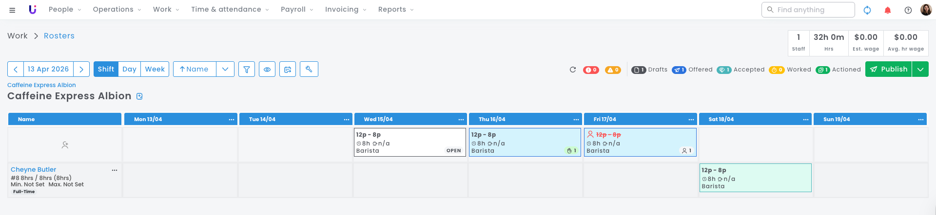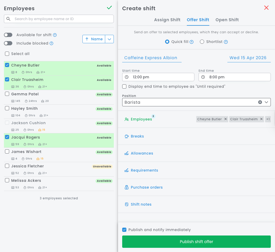Instead of assigning shifts directly, you can offer them to employees or open them up to a wider group, allowing staff to accept or express interest. This gives you flexibility and control while keeping your roster moving.
