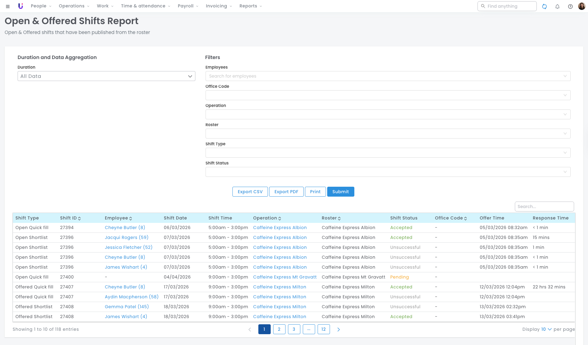 Please note: This report only provides information on offers and open shifts created from the Roster. To keep track of offered shifts added from Bulk Shifts, refer to our Bulk Shift Offers report guide here.
