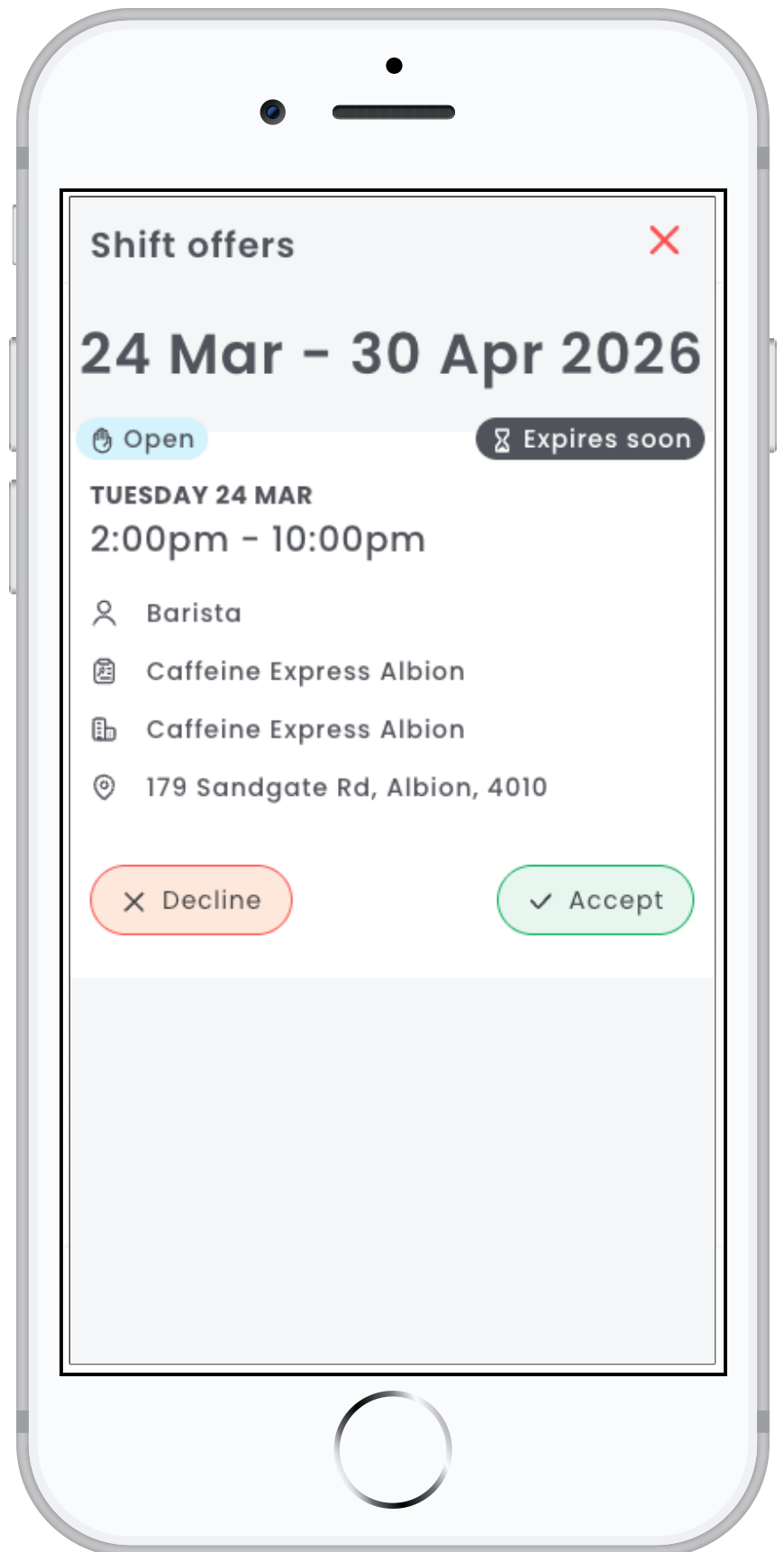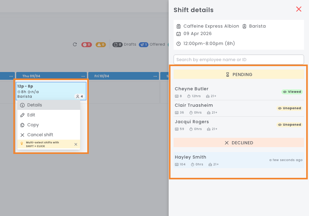 To understand how employees accept or decline offered shifts, please refer to our Employee article on Accept or decline a shift offer.