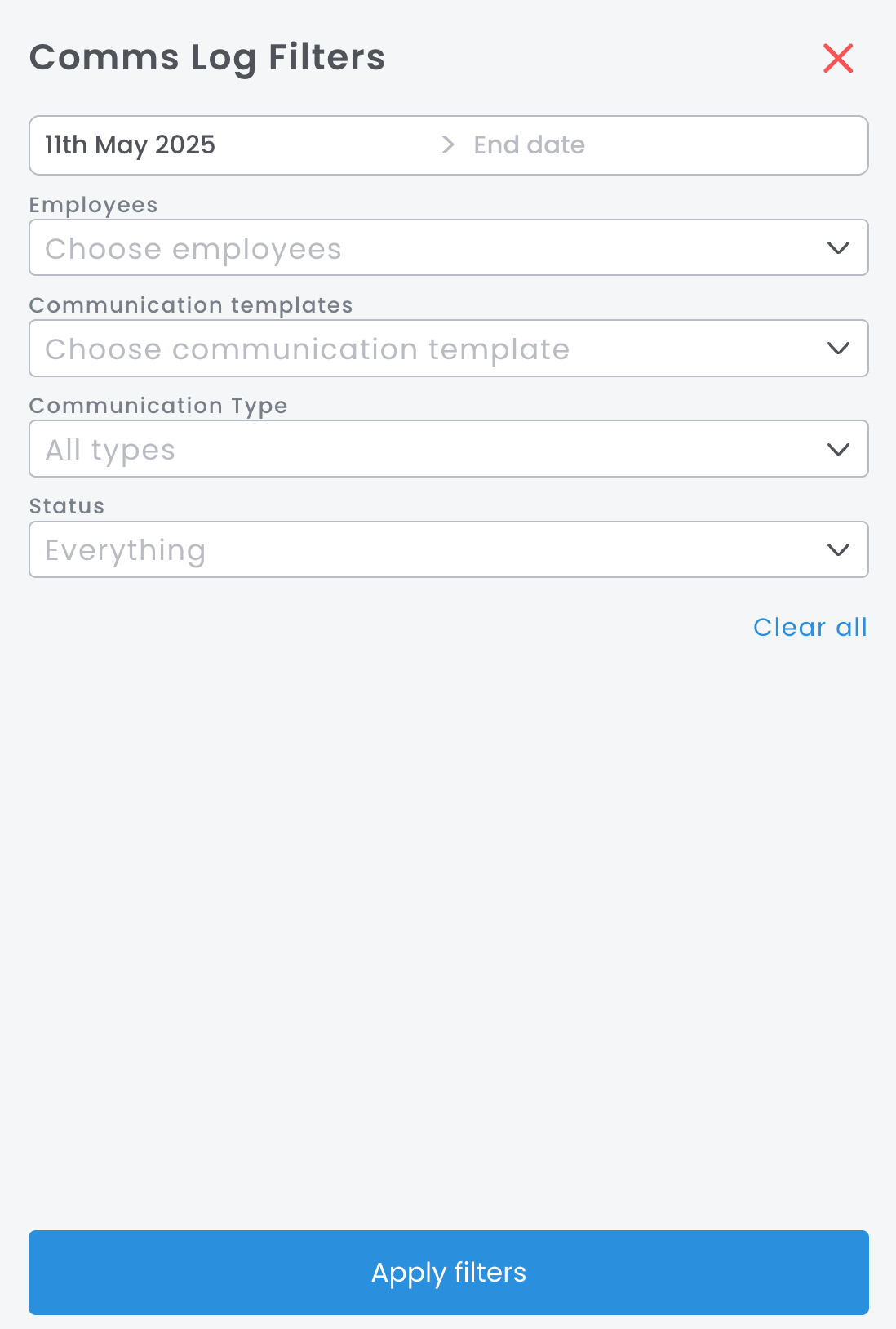 By default, when you first load the Communication Log page, it will show you history from the last 30 days in your platform. You can expand this, or customise your view further by using our filtering tool.