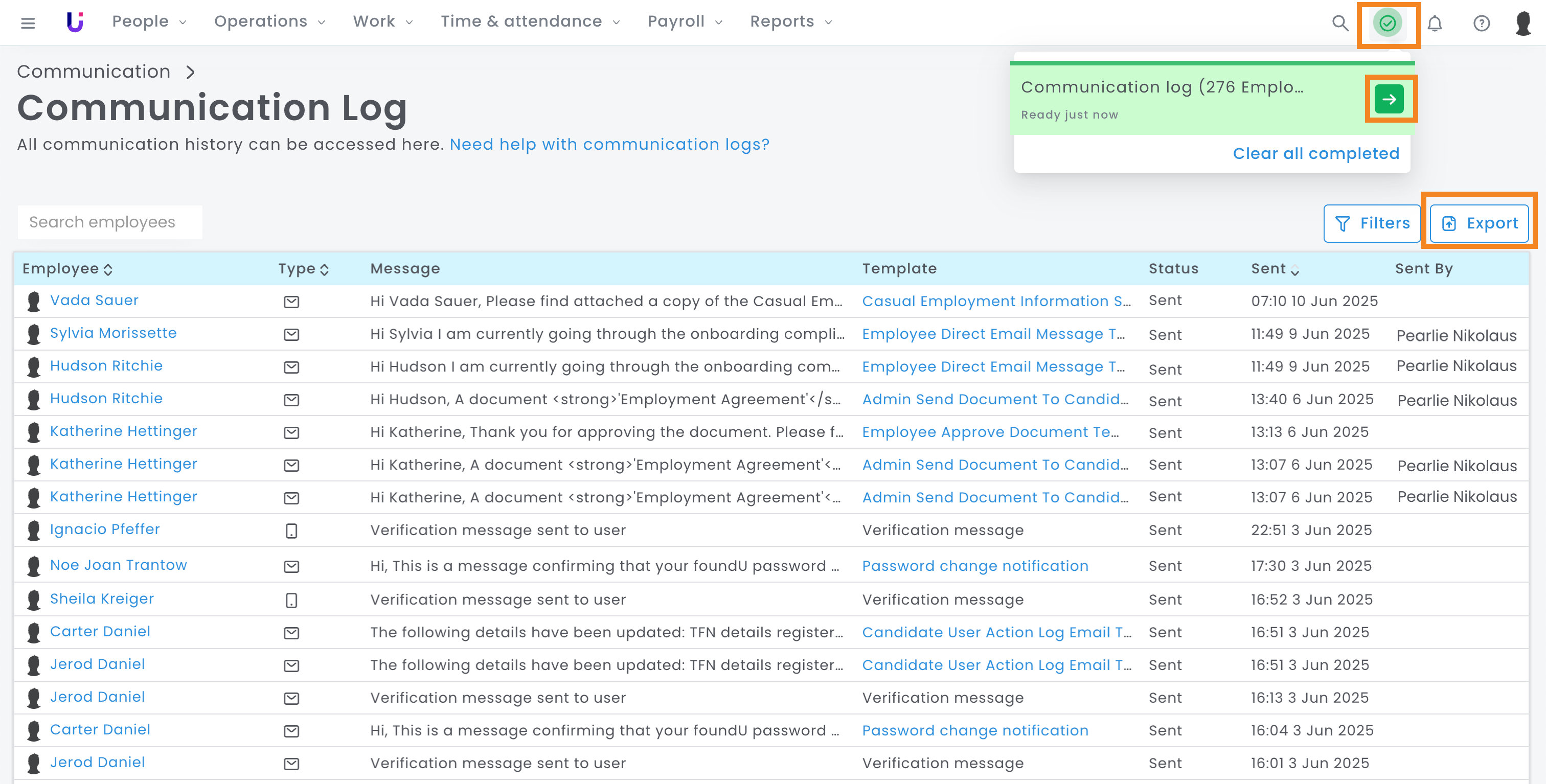 - Navigate to the Communication Log page and select Export from the top right-hand side.