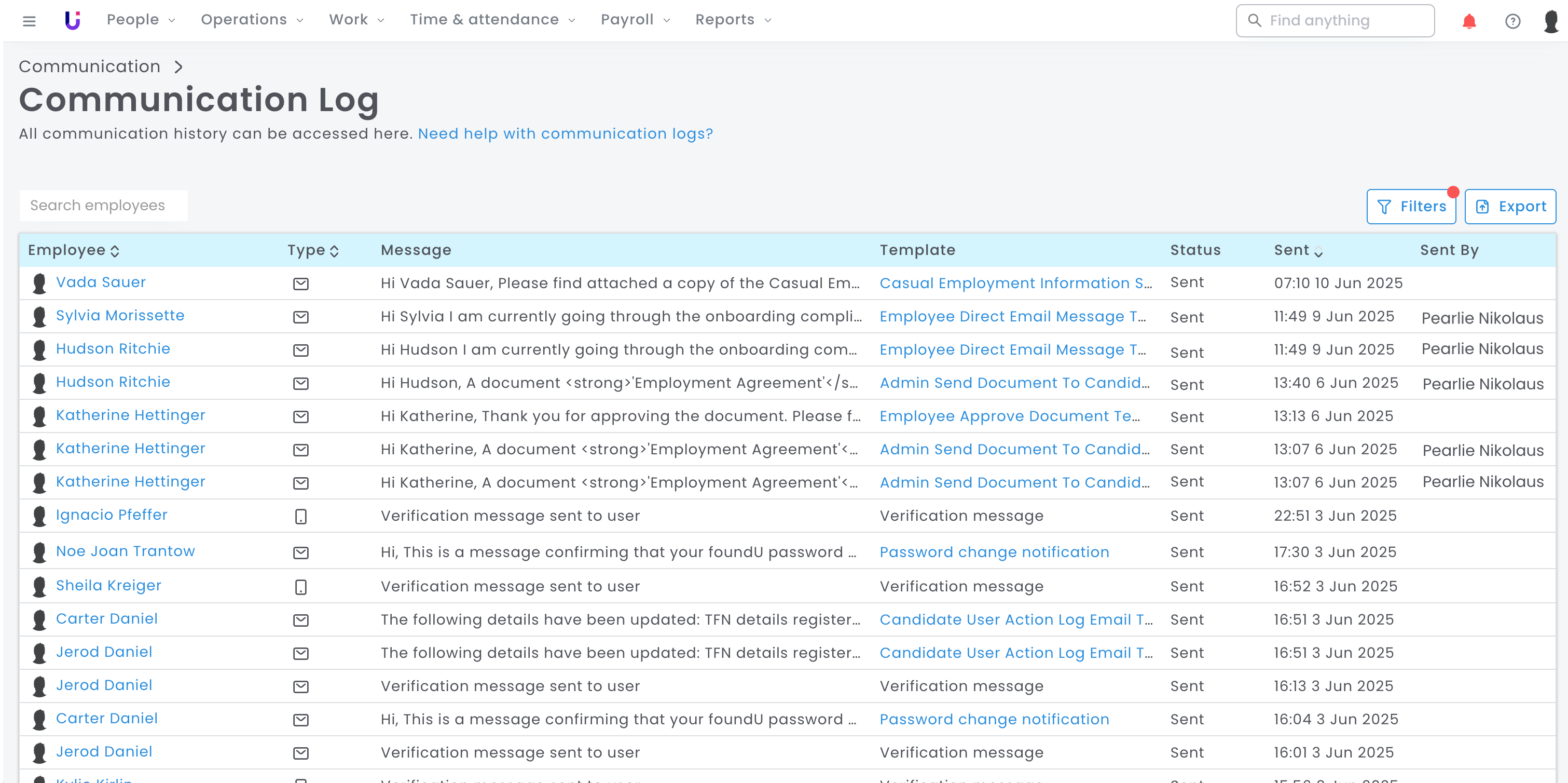 As your platform can send a variety of communications such as SMS, email, or push notifications to your employees, it is valuable to have a history of all communications sent to them so you can view when a communication was sent and often by whom!