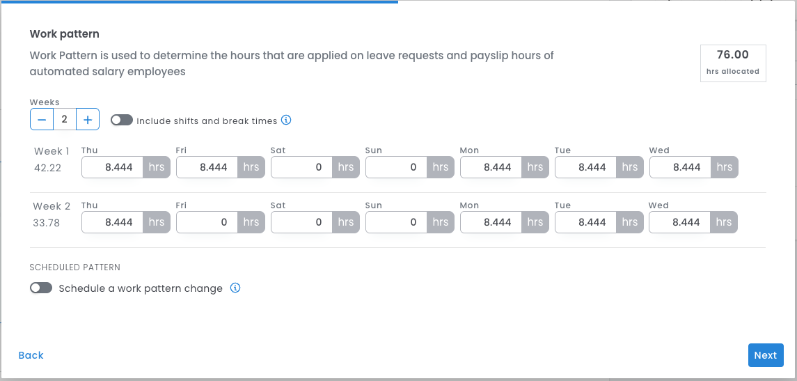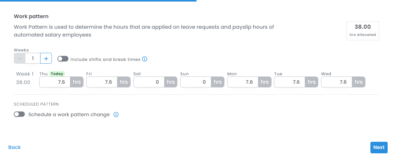 Edit the details on the Work Pattern tab to your requirements, or schedule a work pattern change if the employee's work pattern will be changing in the future. The work pattern is used as the default hours for leave applications and to calculate the hours paid to salaried employees.