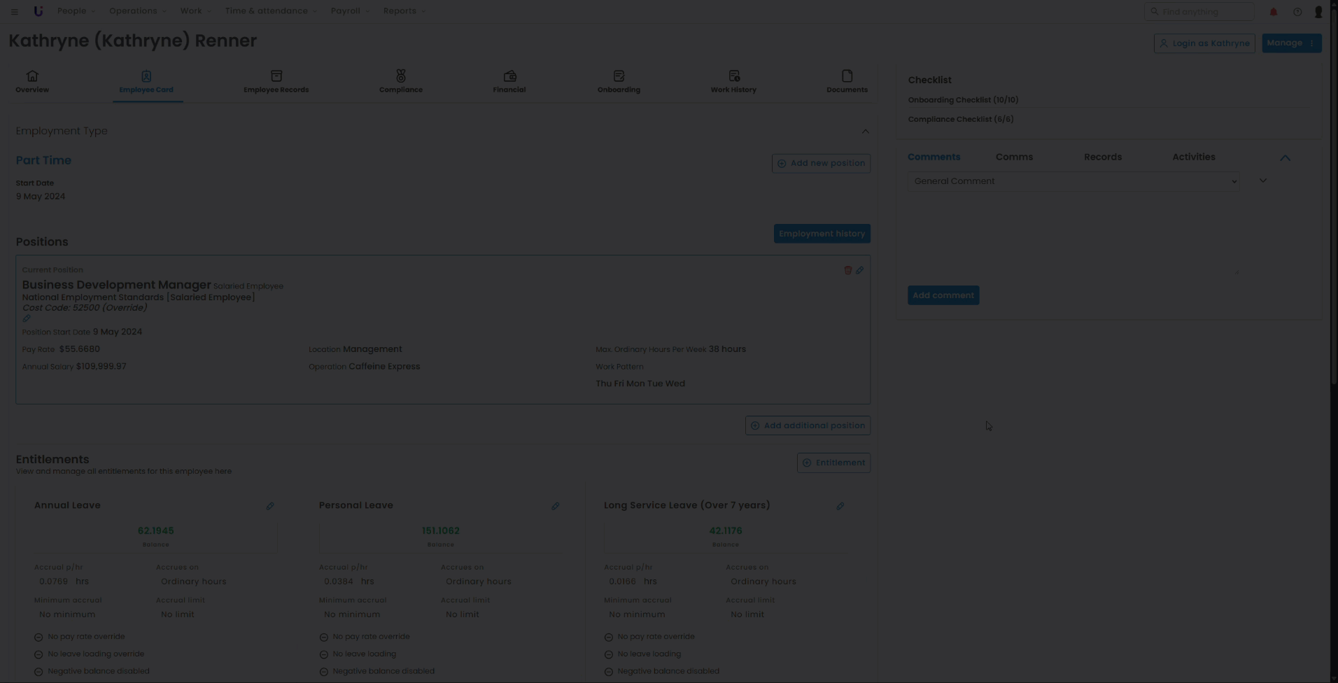 - On the Employee Profile, select Employee Card > Employment Type. This is where you can see the employee's positions, pay rates, and any entitlements.