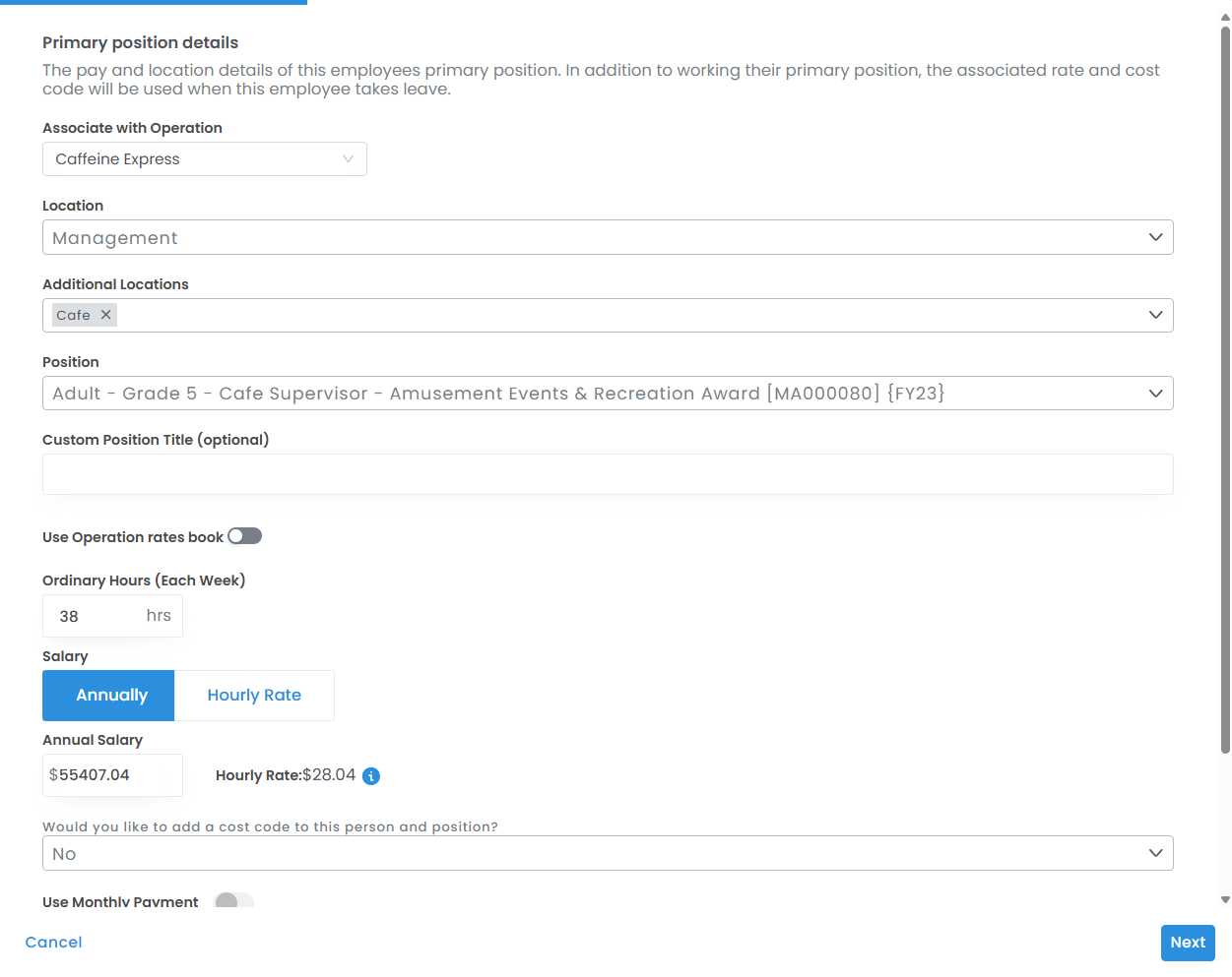 - The primary position is associated with an operation and a cost code, which is used for financial reporting (payroll tax & leave)