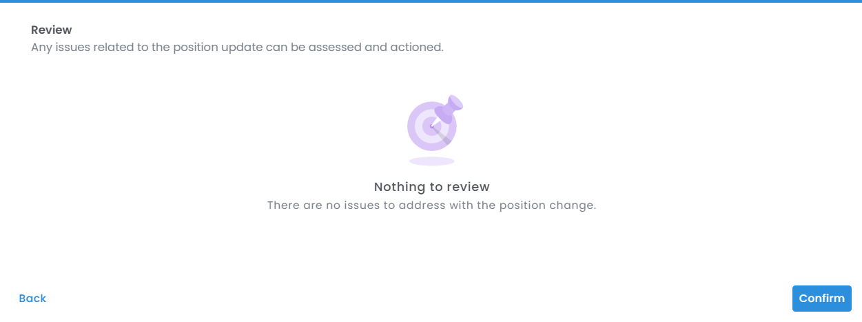 - If there are no issues, select Confirm, and the position will be updated. Please read the section 'Managing issues on the position review menu' below for information on how to handle any issues at the Review stage.