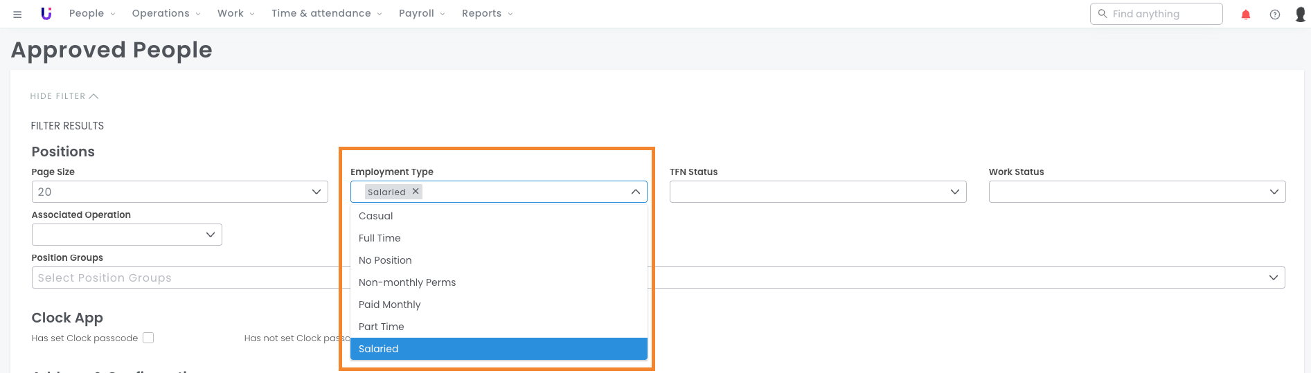 - From Approved People, you can use the Employment Type filter to create a list of all salaried/ monthly employees in your platform.