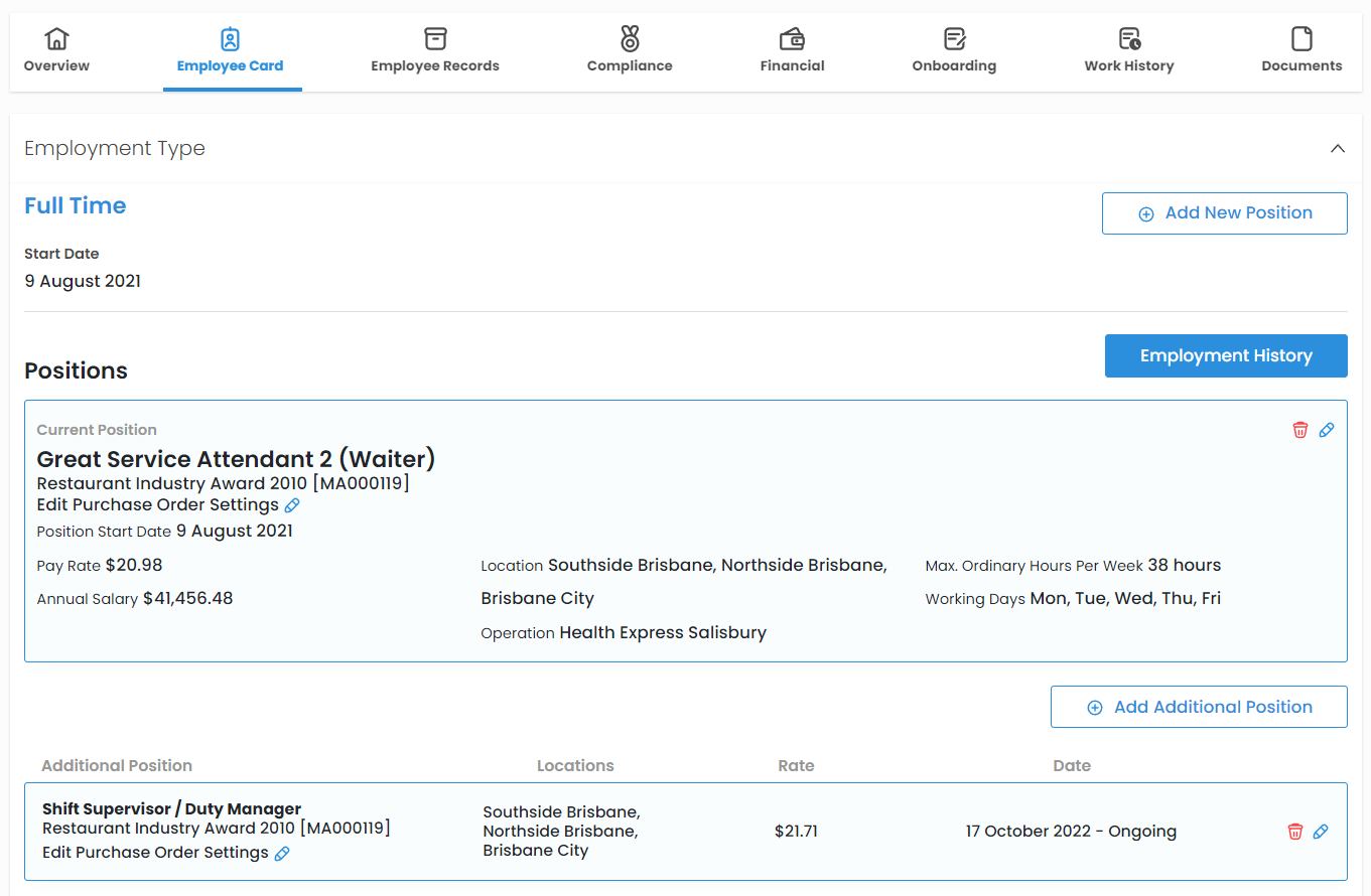 Sometimes, you may need to edit an employee's existing position/s. This could be due to a mistake in their pay rate, cost code, or to update and add additional Locations.