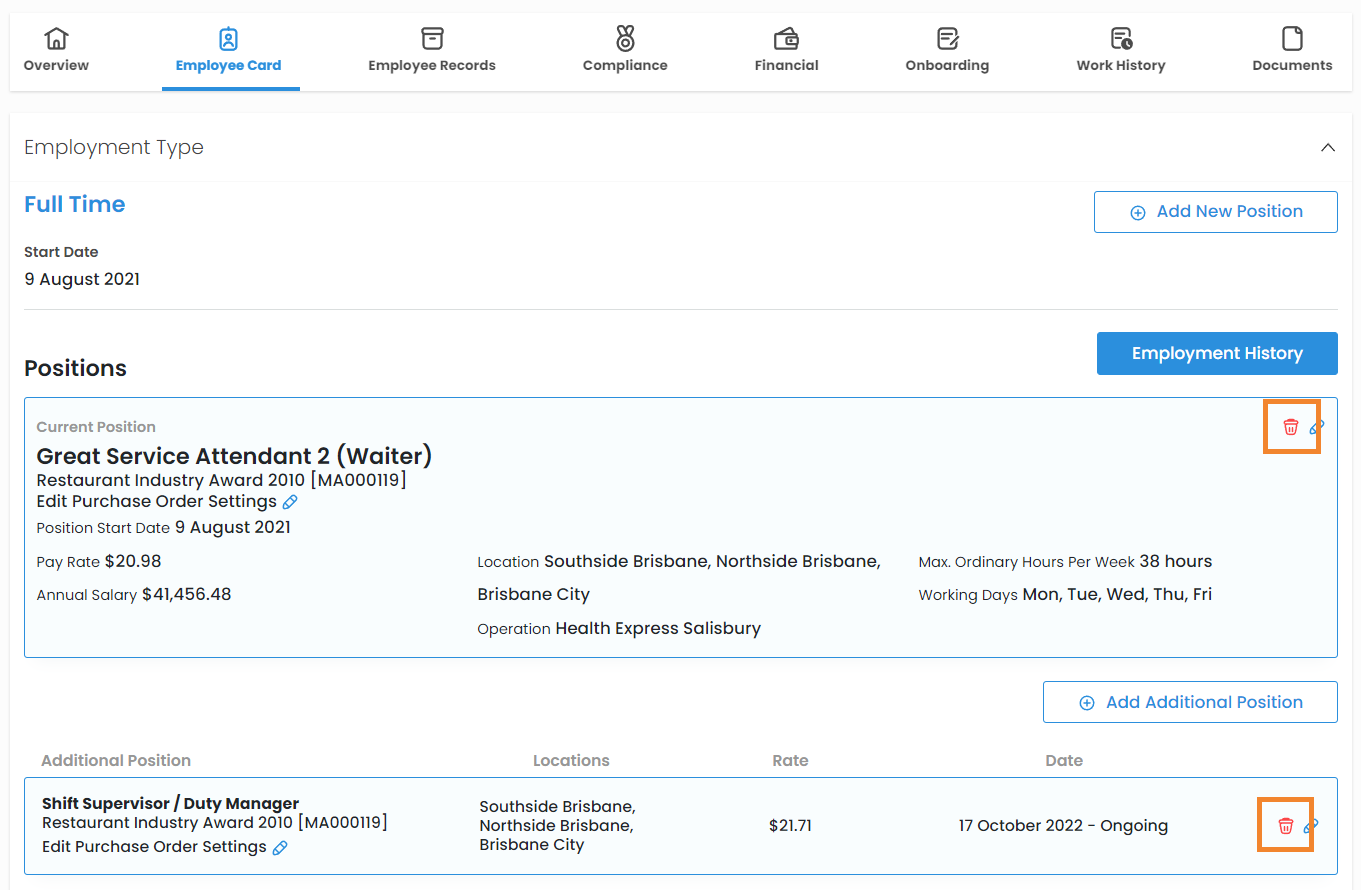 - Select the bin icon to delete the position.