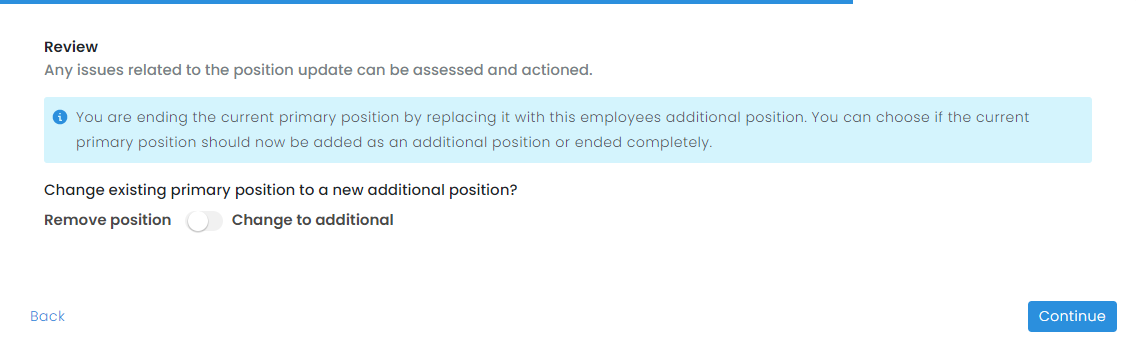 - On the review menu, you will have the option to end the primary position entirely or to have it automatically created again as an additional position. Enable the toggle to swap the primary position with the additional position. With the toggle disabled, the primary position will simply be replaced.