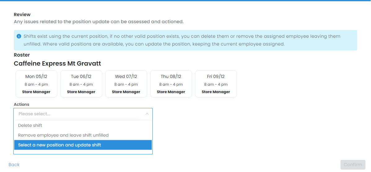 - Select a new position and update shifts - This will update the rostered shifts to the selected position. Available if position groups are not used and the employee has another position.