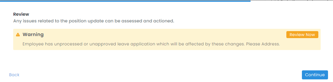 - Continue - The leave application will be updated with the new position details.