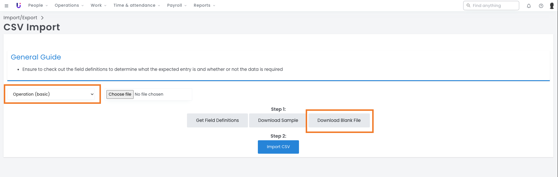 Download a sample CSV file, and select Download Blank File. This document can be edited and used to import your operations.