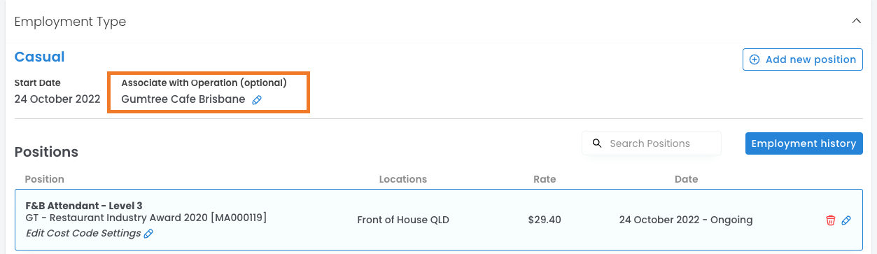 After adding a position to an operation's rates book, the next step is to assign it to employees. When setting up an employee, you can add an Operation to their position in their profile.