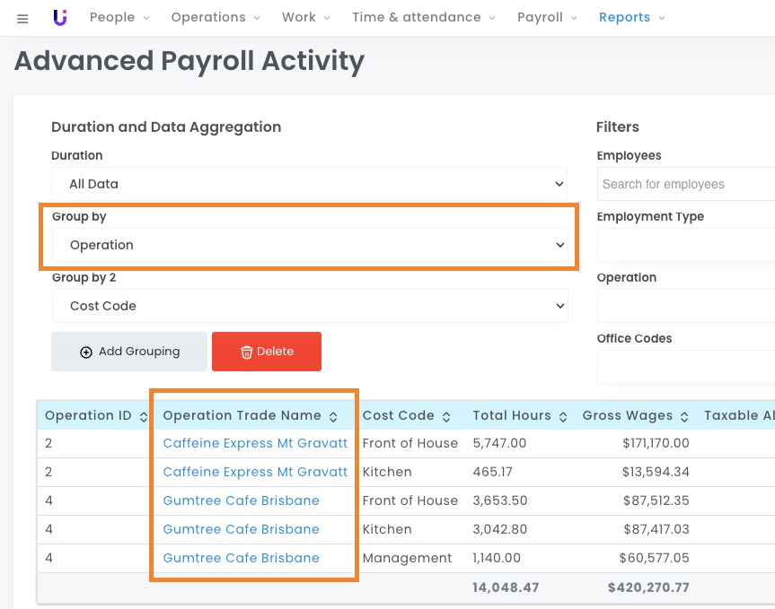 As we can see in the image above, the Advanced Payroll Activity report shows that groupings for Operation and Cost Code have been applied.
