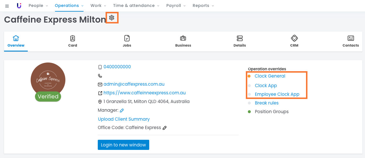 - Operation override links for Clock General, Clock App or Employee Clock App.