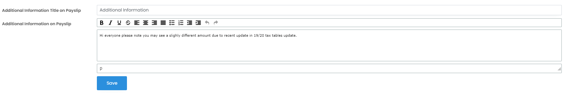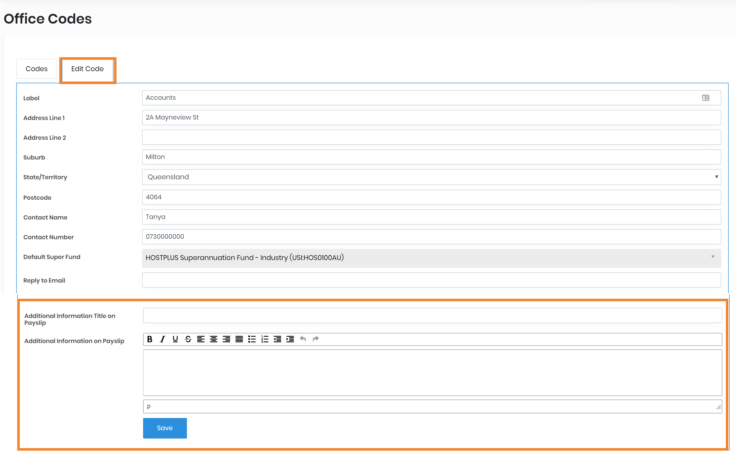 - Add your message by completing the 'Additional Information Title on Payslip' and 'Additional Information on Payslip'. This is available to office codes that have been set up as a paying entity. Click Save.