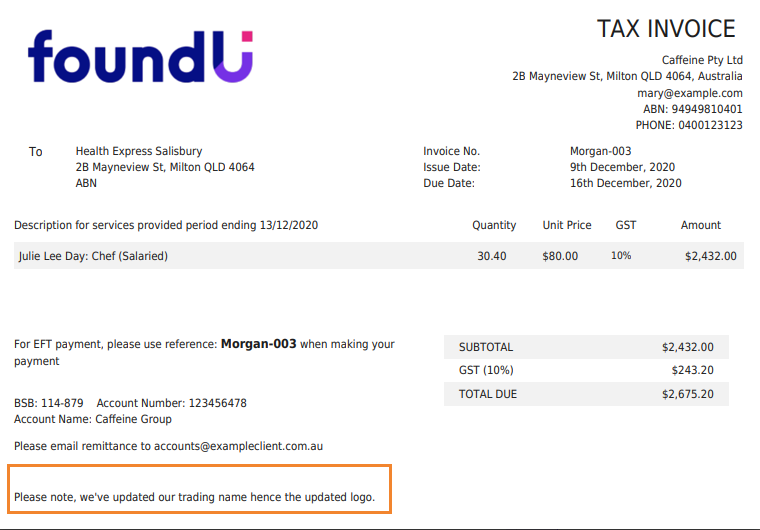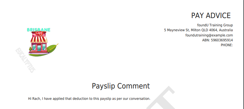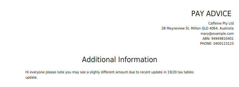 - The message will appear on an additional payslip page upon the next payslip generation. You're also able to add a note for invoices. Repeat for any other office codes that are paying entities.