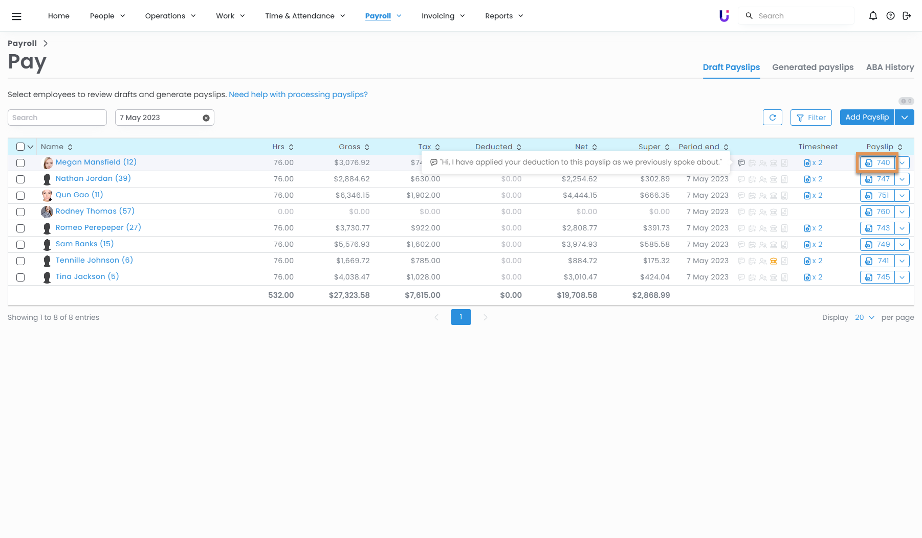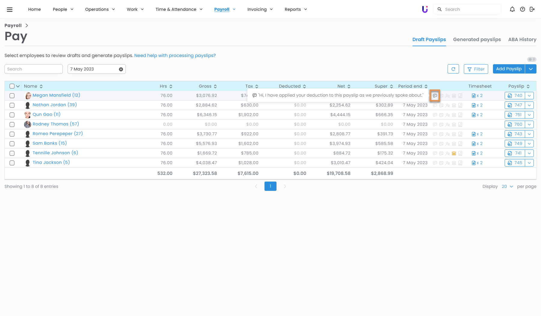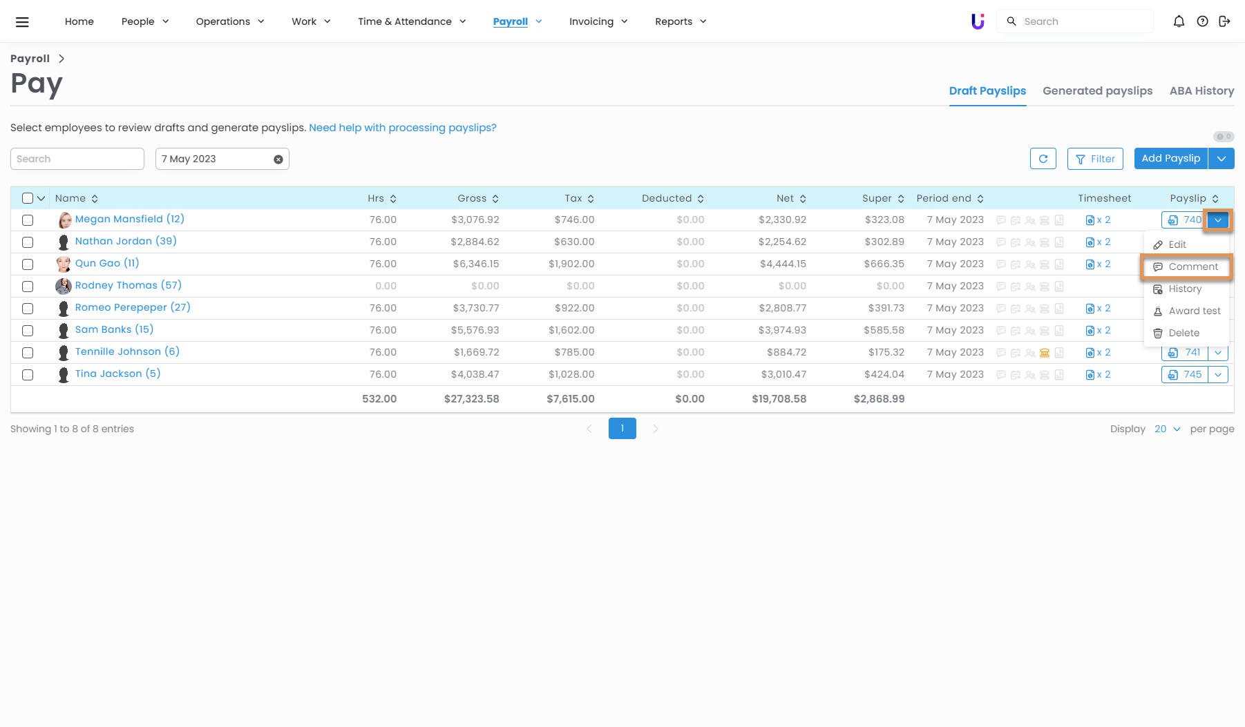 Adding a comment on an employee's payslip is a quick and easy way to communicate to them why you have made a change to their payslip. This can be done on both draft payslips and generated payslips.