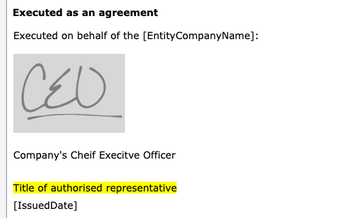 If your company has an Authorised Officer whose signature is used for all contracts, instead of using the Authorised Signature placeholder, you can add their signature as an image when creating the template itself.