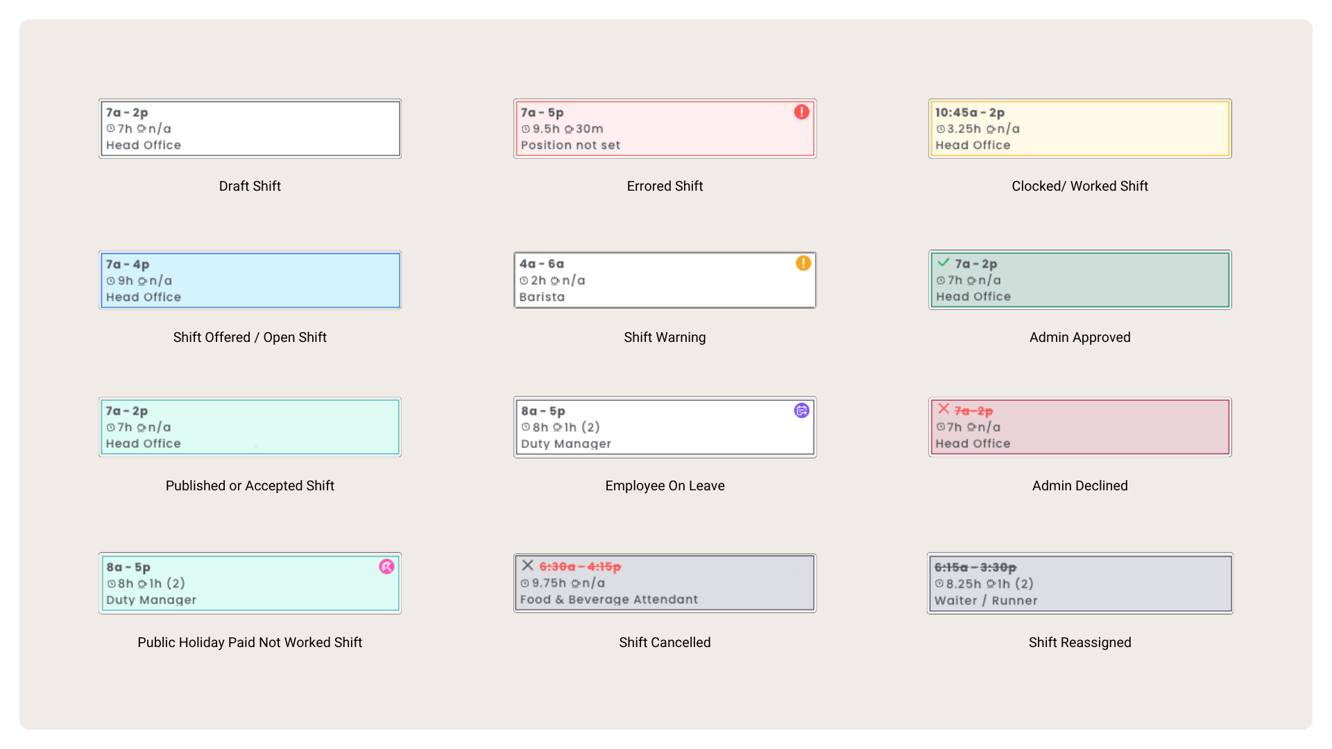 Have you ever wondered why the shifts on your roster occasionally show different colours or feature different symbols? This indicates that your platform is notifying you of any shift status changes, warnings, or errors that could significantly impact the outcome of your rosters.